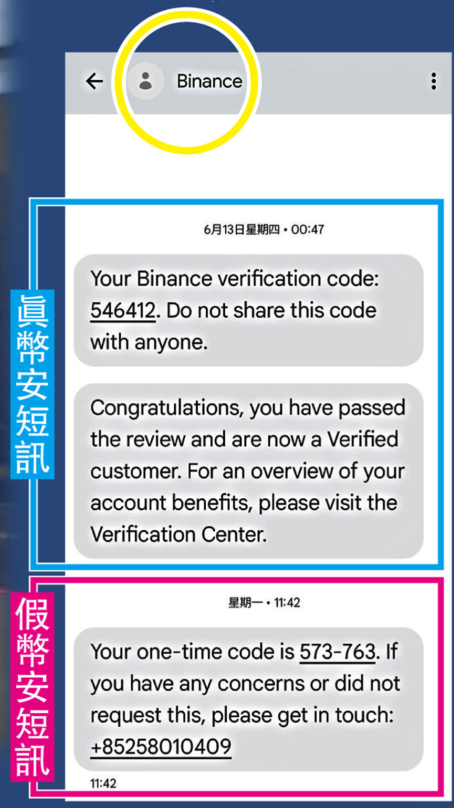 (香港文匯報 記者 曾業俊)香港警方上周一(3月3日)公布,上一星期接獲47宗偽冒加密貨幣交易平台「幣安(Binance)」的釣魚短訊(SMS)騙案,涉款逾250萬元。香港文匯報記者恰巧當日也接到同類詐騙短訊,詐騙短訊與記者的幣安真短訊混合在一起,記者身入虎穴,發現騙徒操流利英語,與以往操半鹹淡廣東話或普通話的「KK園」騙徒不同,市民稍一不慎就「中招」。專家指出真假短訊混雜一起,乃因手機設計是以發送人名稱歸類短訊所致,並教路怎樣識別假短訊真騙徒。