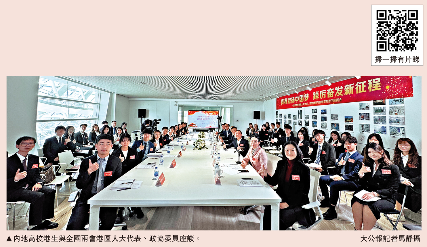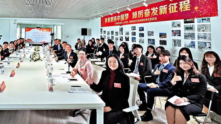 參加座談的港區全國人大代表和全國政協委員勉勵港生們抓住內地學習寶貴機會,裝備自身,用創新思維將港青獨特優勢與香港發展和國家發展大局相結合,為中國式現代化貢獻香港力量。