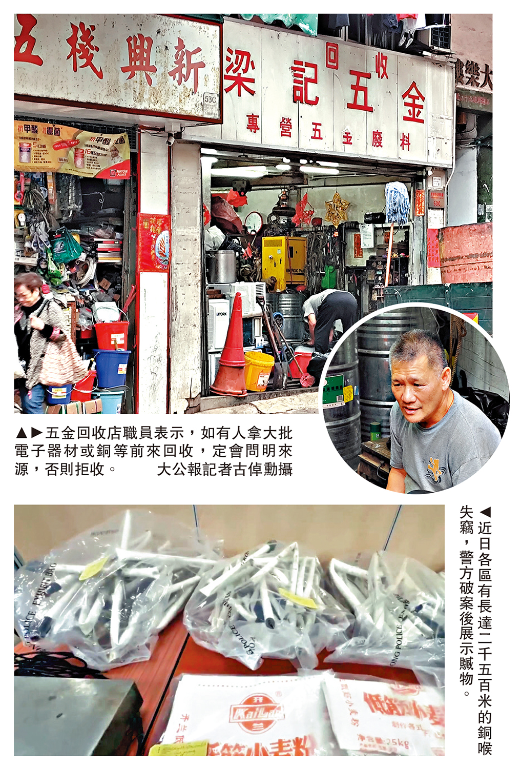 大公報記者昨日到田灣一間五金回收店了解,職員梁先生透露,如今的電器生產成本愈來愈低,塑膠原材料的佔比亦愈來愈高,回收也不值錢,100斤爛鐵只能賣20至30元,所以回收店一般只收金屬、銅管等廢物。他說,若遇到有人拿大批電子器材和銅等物品前來回收,一定會懷疑其出處,行內一貫做法會問及物品的出處,若可以明顯看到物品上有政府或其他機構的標誌,除非對方能提供批准其拿來回收的單據或證明,否則一律拒收避免犯法。