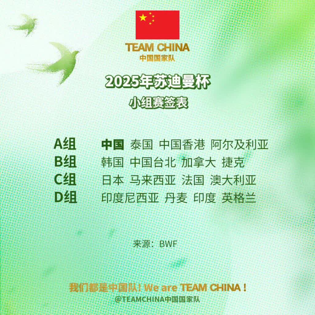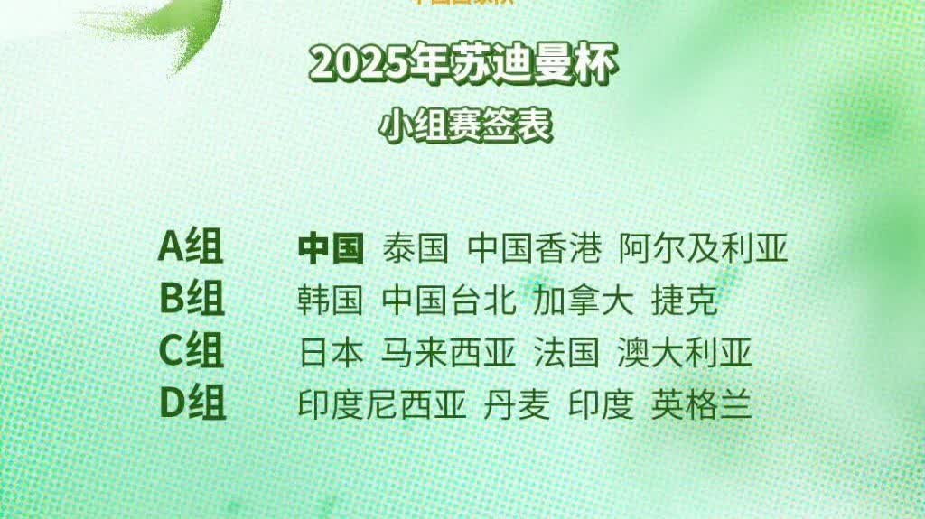 據新華社報道,2025年羽毛球蘇迪曼盃抽籤儀式13日在中國廈門舉行,中國隊被分在A組,同組的還有泰國隊、中國香港隊和阿爾及利亞隊。