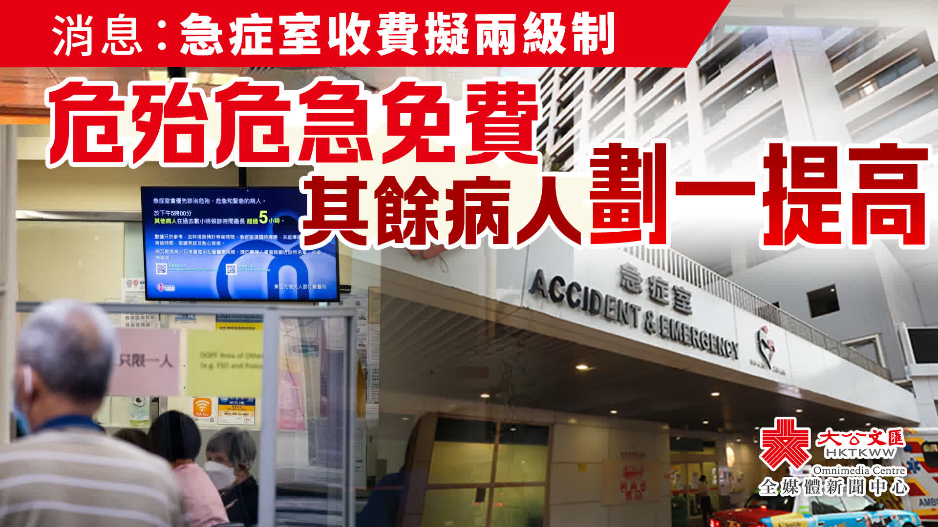 大公文匯全媒體報道,公營醫療收費檢討公布在即。有消息指,當局擬將急症室收費實施兩級制,危殆及危急病人免費,緊急、次緊急和非緊急等三類病人的收費則由現時180元,提高至與私家診所相若。