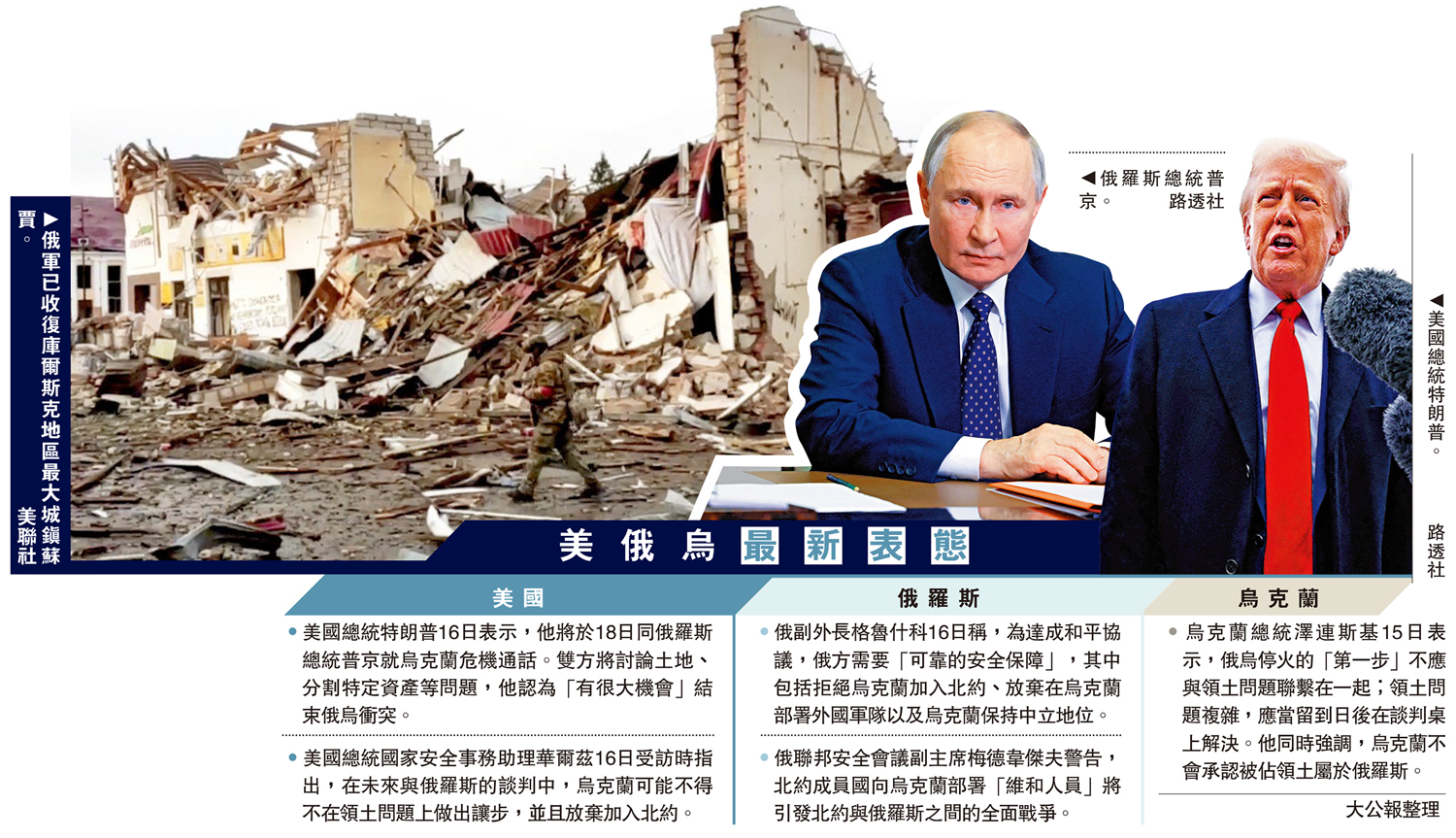大公報綜合報道,美國總統特朗普16日表示,他將於18日與俄羅斯總統普京通話,討論結束俄烏衝突有關問題。克里姆林宮17日證實了這一消息。連日來,美俄烏三方頻頻放風:美官員暗示烏方恐須在領土問題讓步,且加入北約希望「極小」;俄官員稱拒絕烏克蘭加入北約是達成協議的保障;烏官方則堅稱不會承認被佔領土屬於俄羅斯。分析認為,俄烏目前圍繞領土主權、加入北約等問題分歧依然明顯,能否實現停火仍存變數。