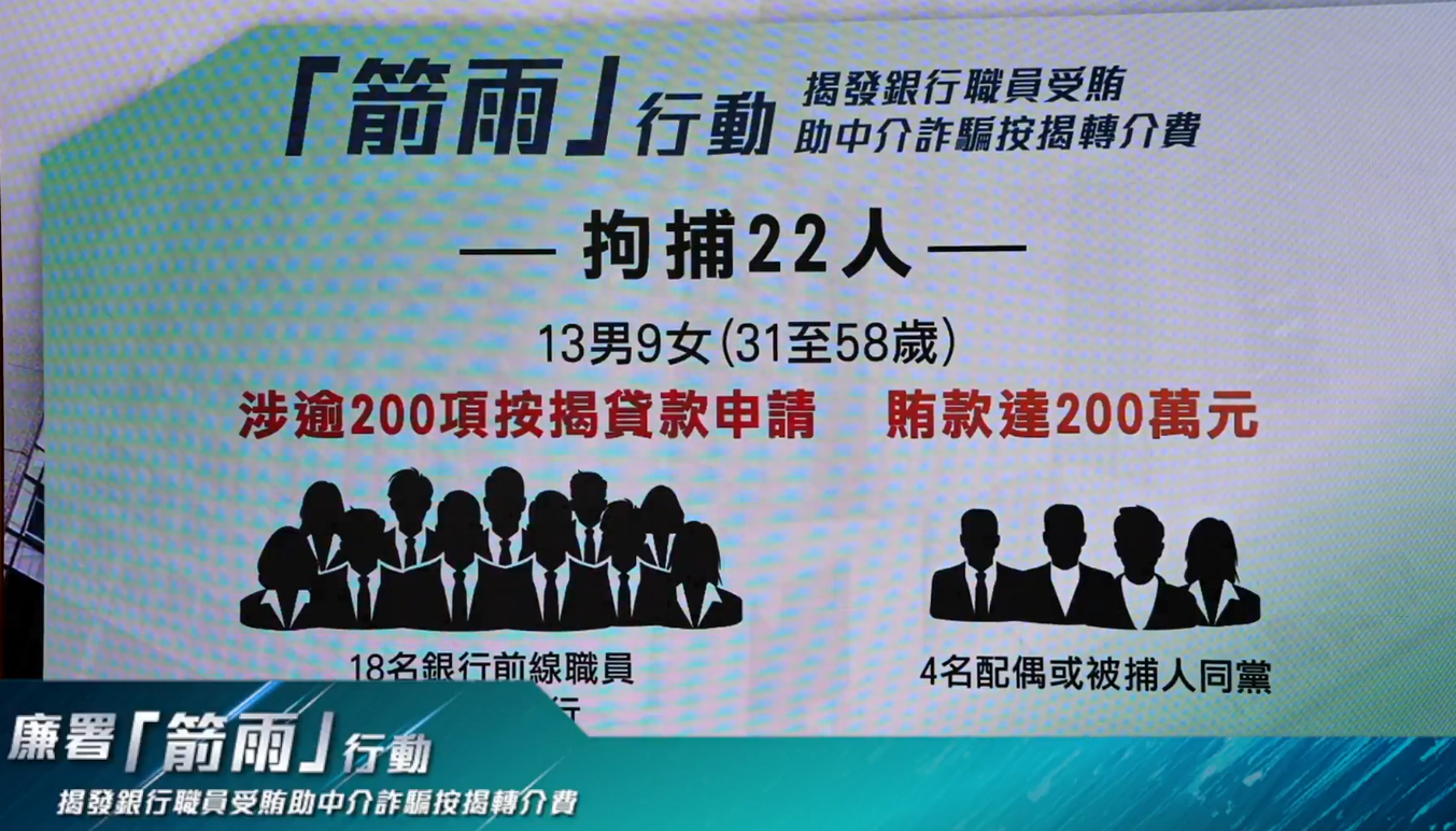 大公文匯全媒體報道,廉政公署今日(18日)舉行「箭雨」行動新聞簡報會,揭發銀行職員受賄助中介詐騙按揭轉介費的不法行為。行動共拘捕22人,包括18名銀行前線職員以及4名配偶或被捕人同黨,共13男9女,年齡介於31至58歲。