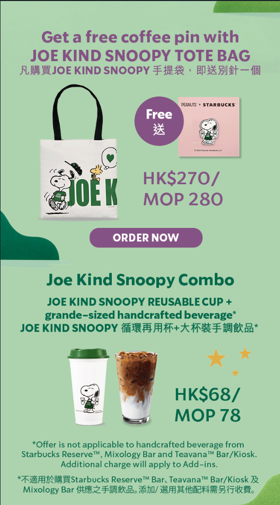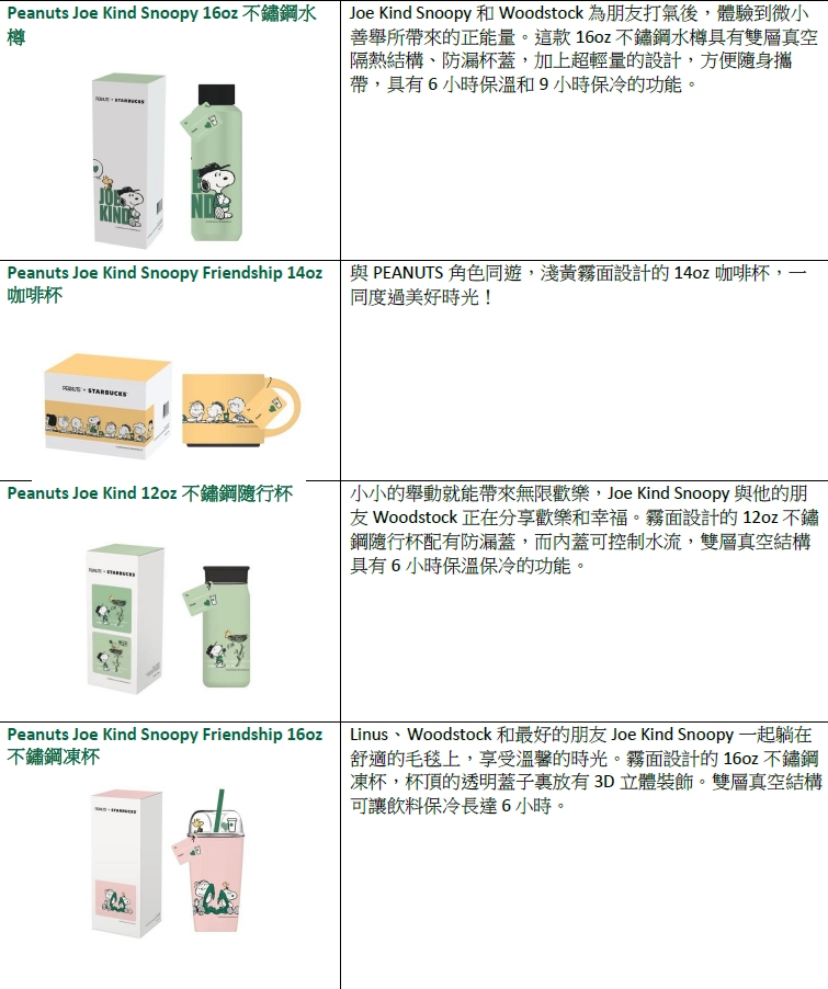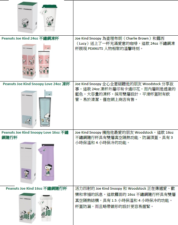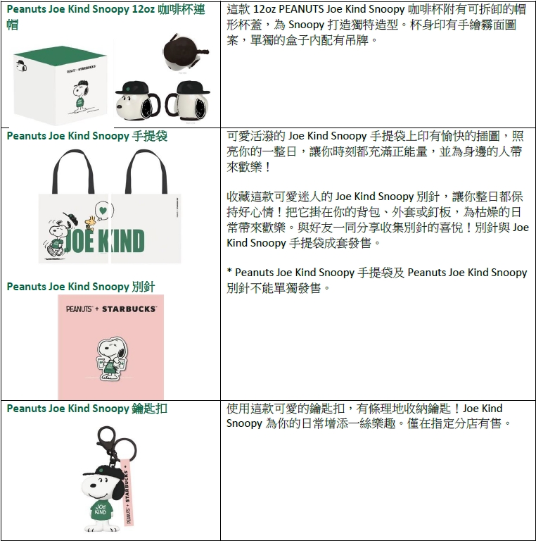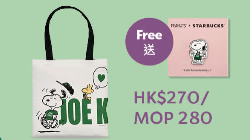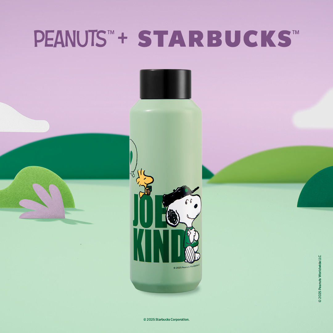 星巴克與PEANUTS推出獨家限量版Joe Kind Snoopy商品系列,以經典帽子杯蓋的Peanuts Joe Kind Snoopy咖啡杯品嘗咖啡,或者使用印上無憂無慮的Peanuts Joe Kind Snoopy手提袋攜帶日常必需品。
