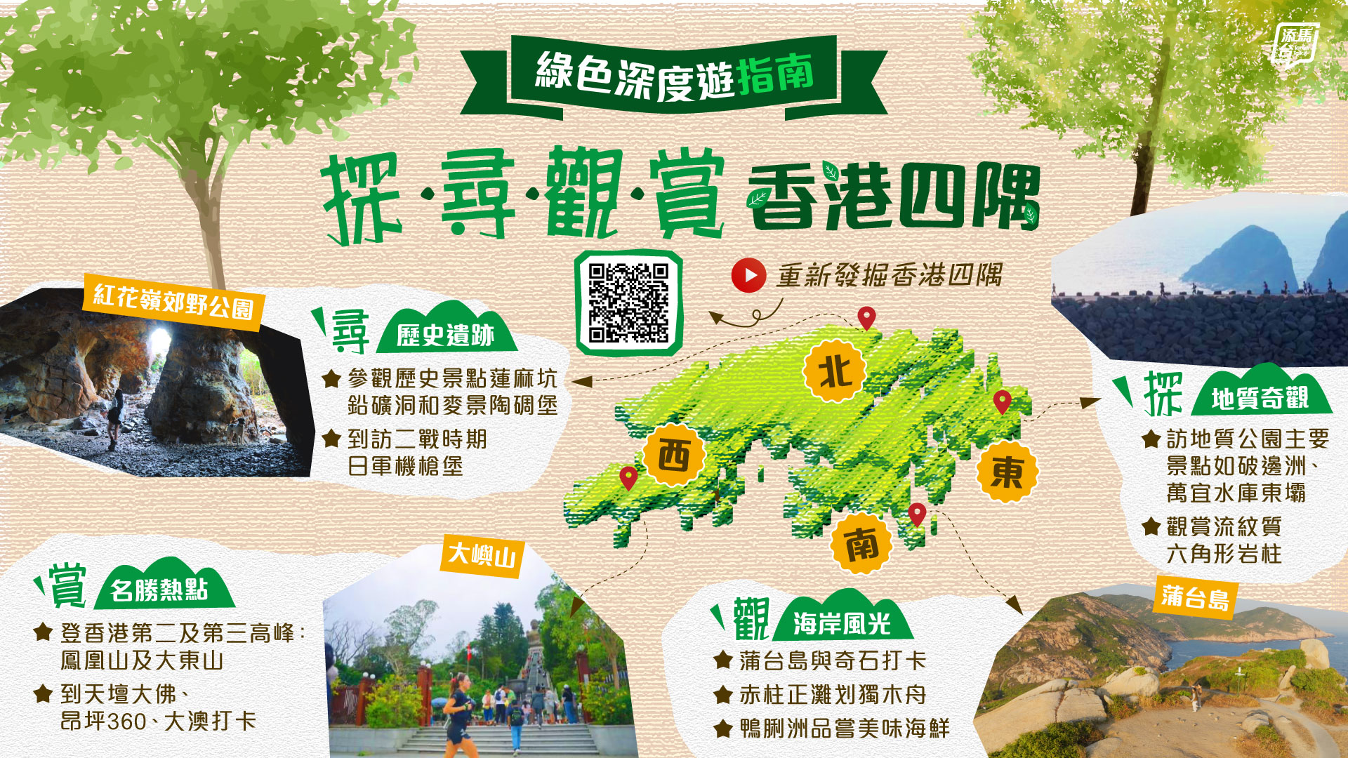 香港綠色生態旅遊資源豐富,自然美景與繁華鬧市咫尺之隔。這次帶大家上山下海,探尋和觀賞香港四隅的大自然風光,包括東面的香港聯合國教科文組織世界地質公園、南面的蒲台島、赤柱和香港仔、西面的大嶼山,以及北面的紅花嶺郊野公園。看圖了解更多,助你輕鬆規劃行程。