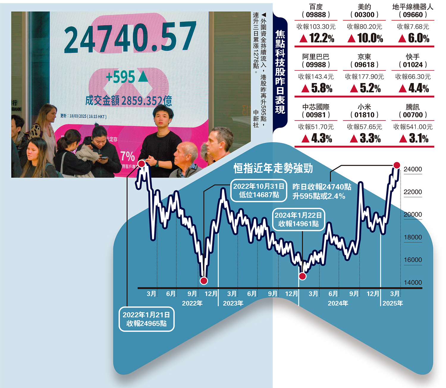 美國科技股反彈,帶動資金流入港股科技板塊,恒指昨飆升595點或2.4%,收報24740點,創2022年2月以來新高。科技指數表現更強勁,全日升232點或3.9%,收報6105點。主板成交額達2859億元,較上日增加411億元。恒指過去三日累漲1278點。