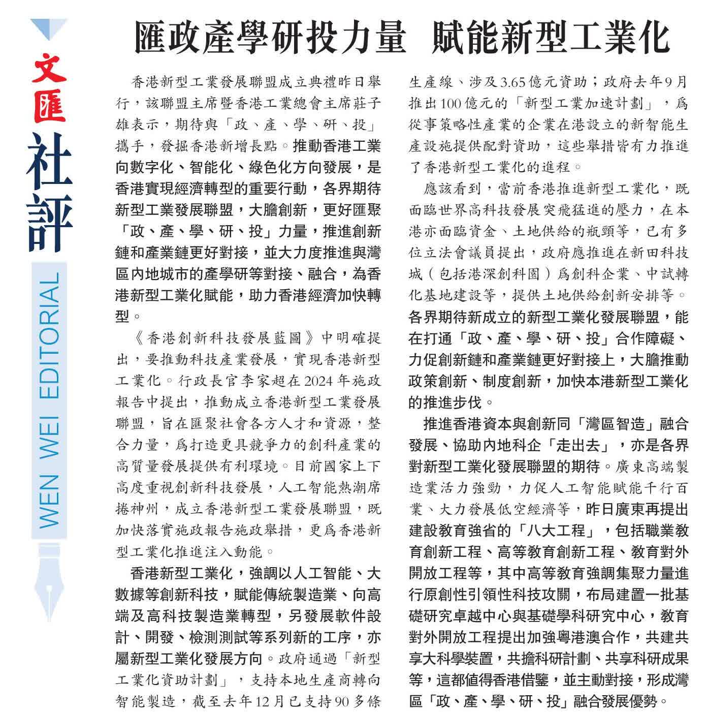 《香港創新科技發展藍圖》中明確提出,要推動科技產業發展,實現香港新型工業化。行政長官李家超在2024年施政報告中提出,推動成立香港新型工業發展聯盟,旨在匯聚社會各方人才和資源,整合力量,為打造更具競爭力的創科產業的高質量發展提供有利環境。目前國家上下高度重視創新科技發展,人工智能熱潮席捲神州,成立香港新型工業發展聯盟,既加快落實施政報告施政舉措,更為香港新型工業化推進注入動能。