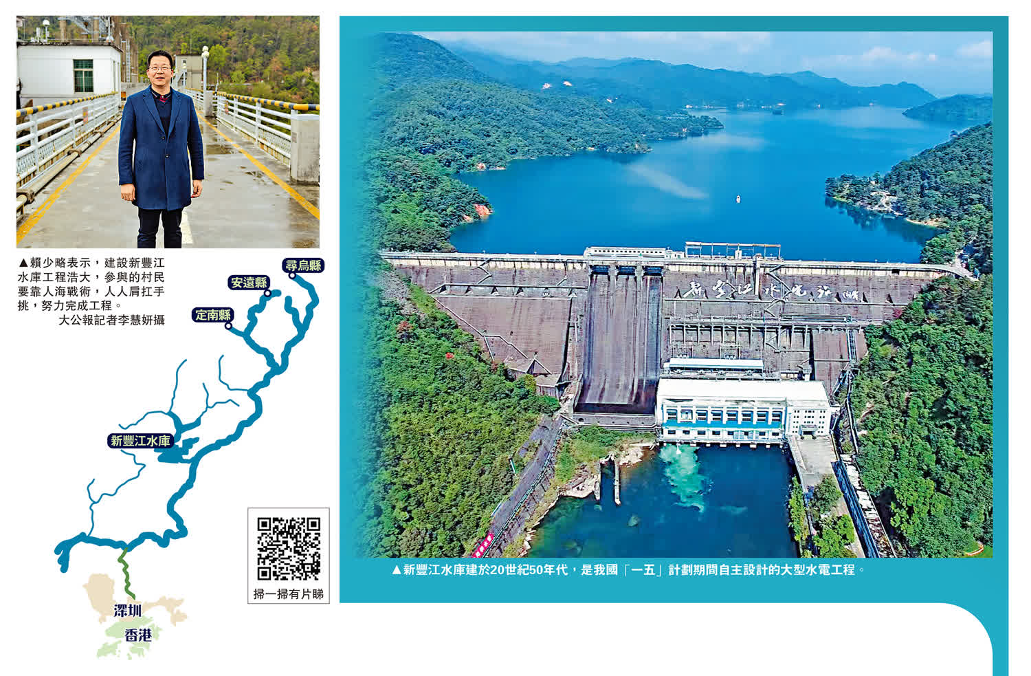 大公報連續專題報道。大公報記者來到廣東省河源市萬綠湖,探尋東深供水工程的重要水源地——新豐江水庫。1958年,國家第一個五年計劃重點工程——新豐江水電站開始建設,攔截東江最大支流,形成水域面積達370平方公里的新豐江水庫,至此新豐江水庫成為香港、深圳、東莞等東江下游城市4000多萬居民的重要飲用水保障。