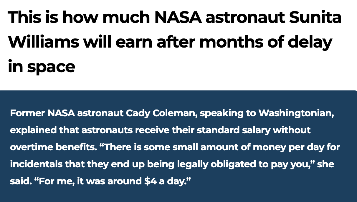 前NASA宇航員凱蒂·科爾曼近日在接受美媒採訪時透露,宇航員的薪資為標準工資,不含加班補貼。她說,雖然每天會發放一定數額的補貼,但根據法律規定,這些錢是必須支付的。科爾曼以自身為例,稱其每日補貼金額約為4美元。