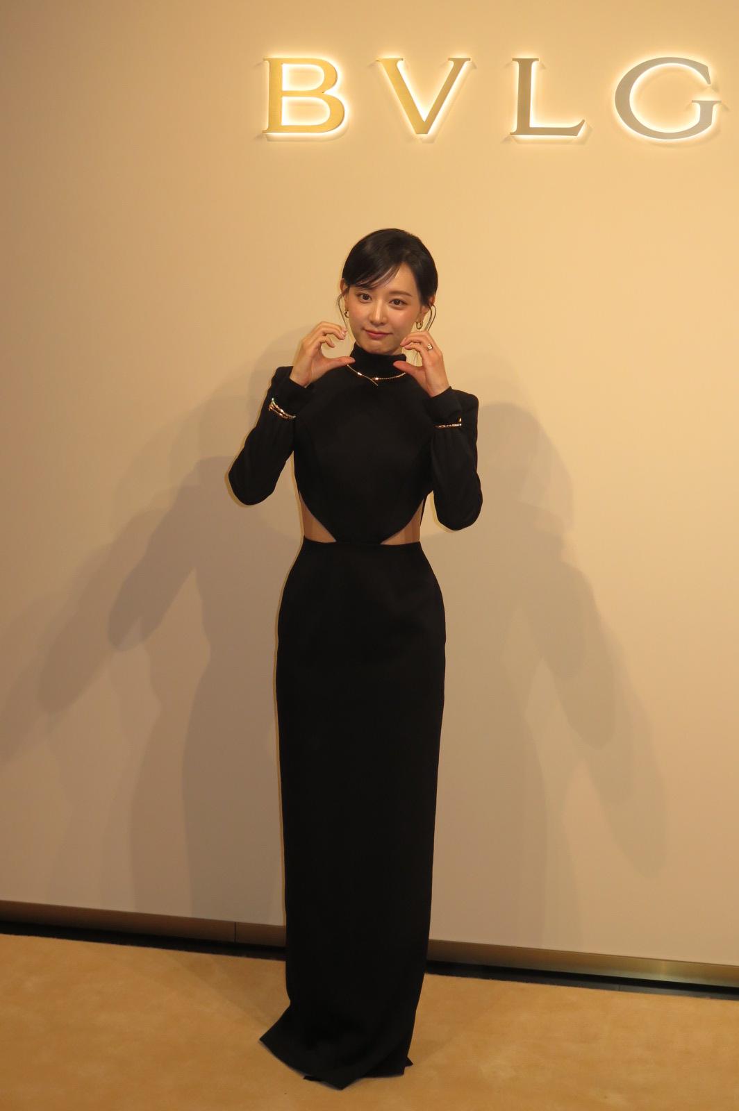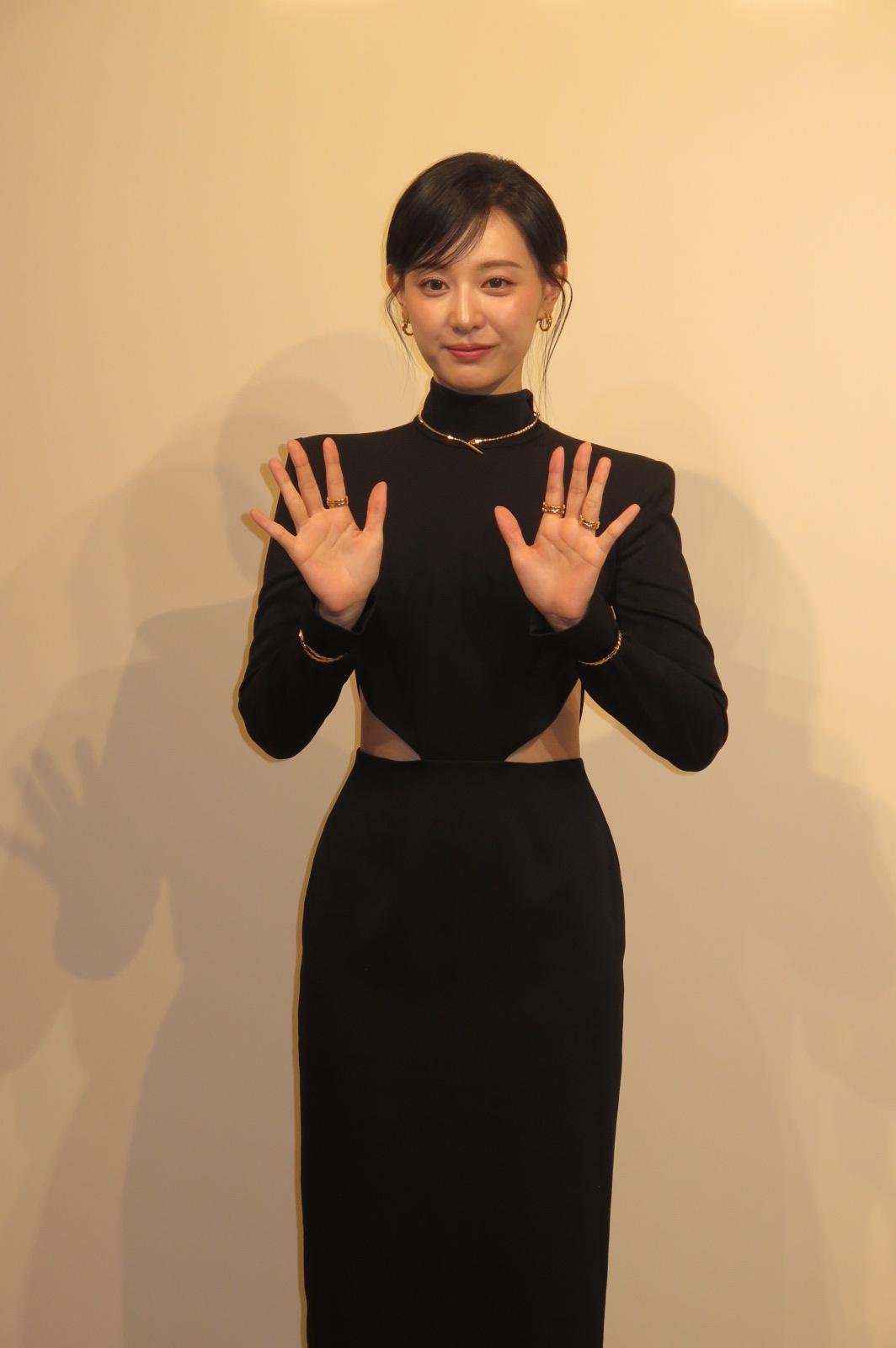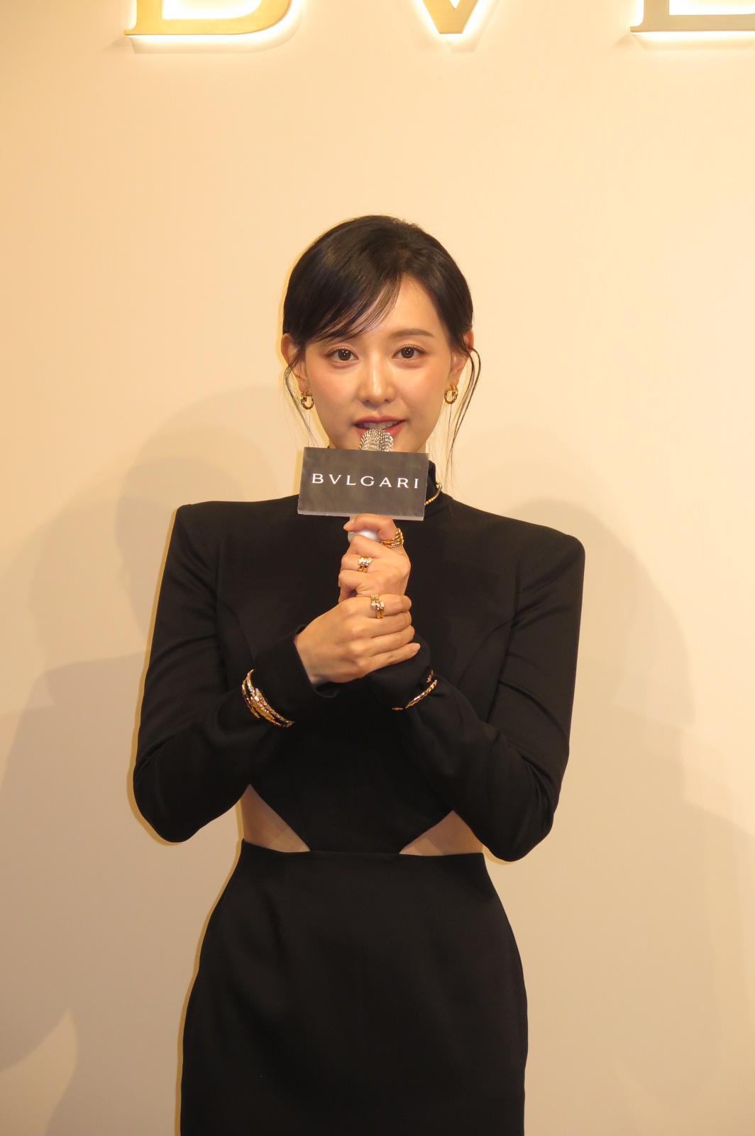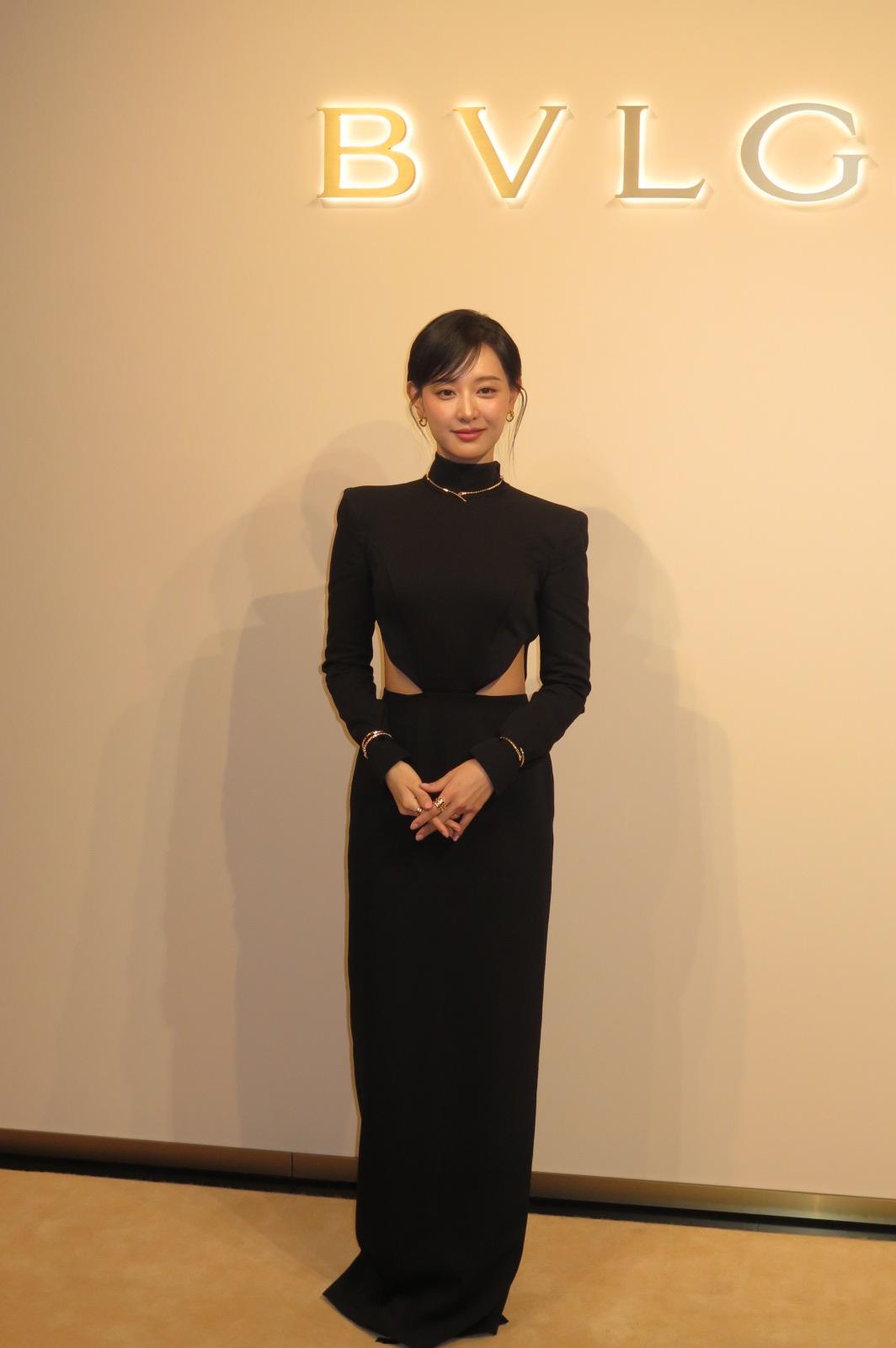 身穿黑色長裙露背長裙的金智媛,盡顯優雅與高貴。她表示因品牌而來港感到高興,之後再分享穿載飾物心得。