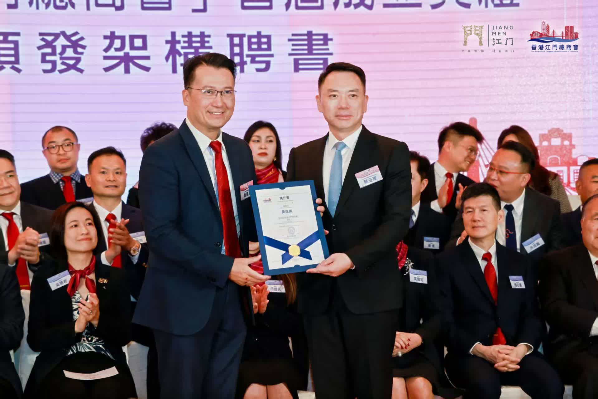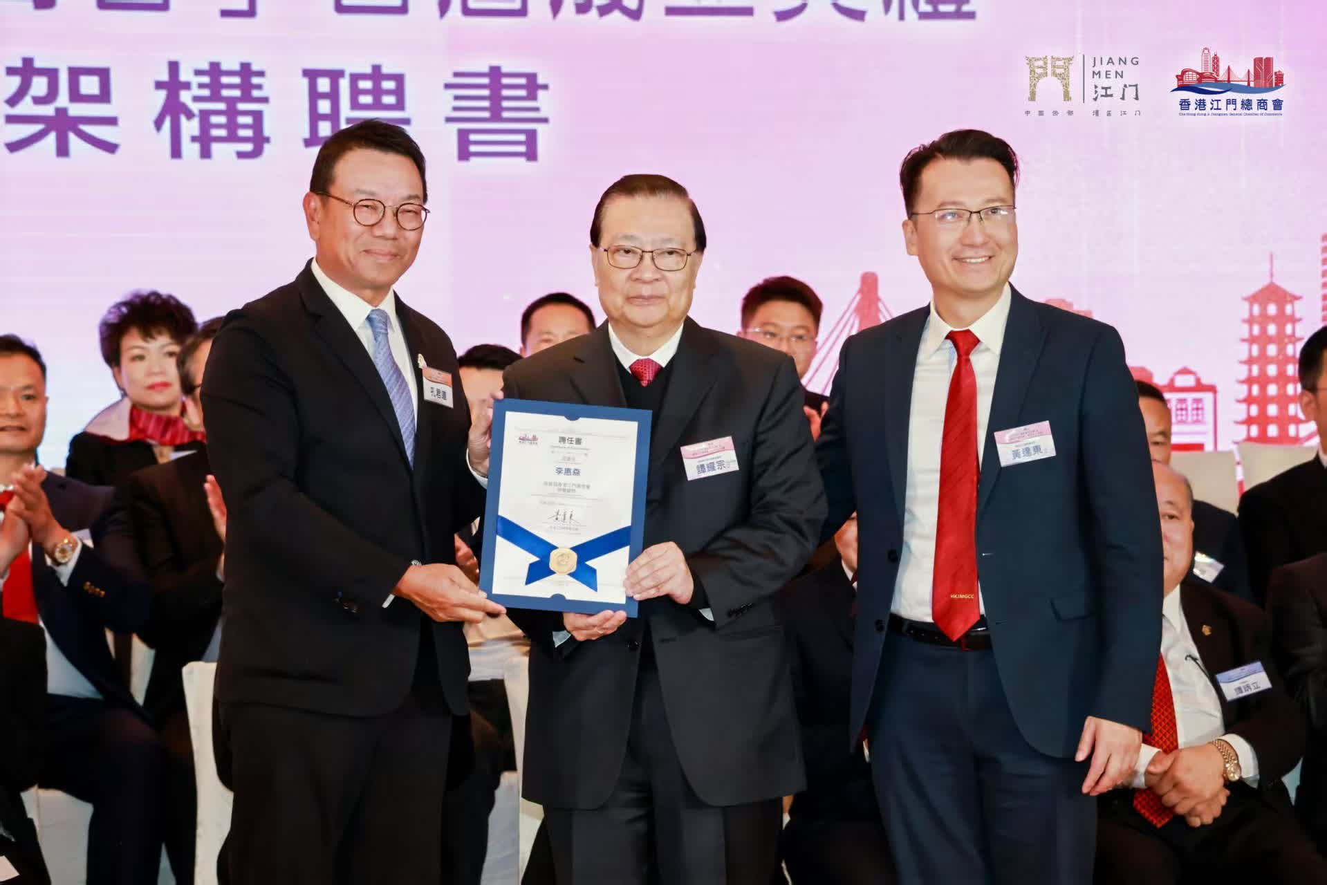 現場還舉行了香港江門總商會首屆成立典禮啟動儀式。陳岸明、林智遠對香港江門總商會首屆架構成員宣誓儀式進行監誓,蘇玉軍向香港江門總商會主席黃達東頒發聘書。香港特區政府政制及內地事務局副局長胡健民視頻祝賀,譚耀宗發表致辭。江門市投資促進局和香港江門總商會簽署江港合作協議,推動香港江門協同發展、共同繁榮。