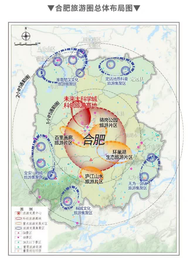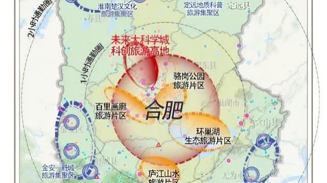 依託科創資源和文旅休閒資源,規劃確立了合肥旅遊圈「一心五區」總體發展格局,推動旅遊圈高水平協同發展。「一心」圍繞未來大科學城科創旅遊高地和駱崗公園片區、環巢湖片區、江淮運河百里畫廊片區、廬江山水片區的「1+4」功能板塊。「五區」為合肥周邊縣(市、區)五大旅遊發展集聚區,包含淮南楚漢文化旅遊集聚區、桐城文化旅遊集聚區、六安山水休閒旅遊集聚區、定遠文化休閒旅遊集聚區、無為——含山旅遊集聚區。