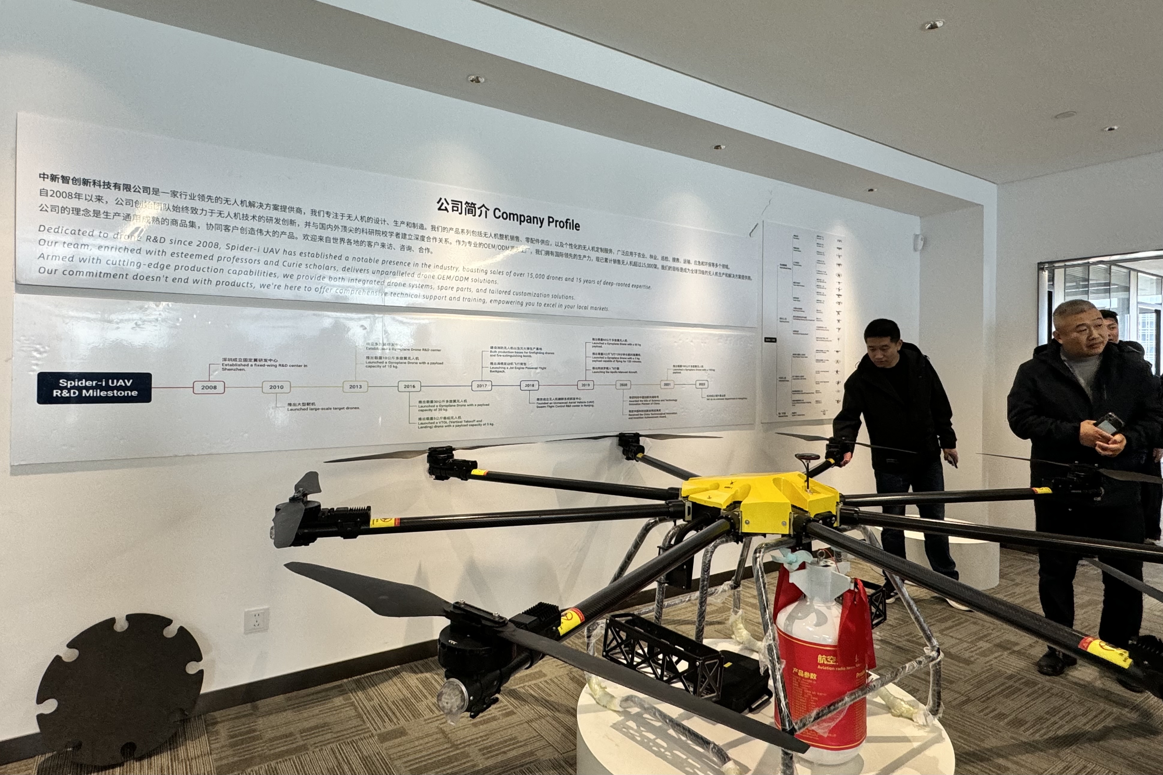 智慧網谷小鎮內,一架四米多長寬,近一米高度的大型無人機從地面上緩緩升起,專業人士為採風團演示着消防無人機快接地面消防車,飛行至50米空中進行高空滅火的過程。
