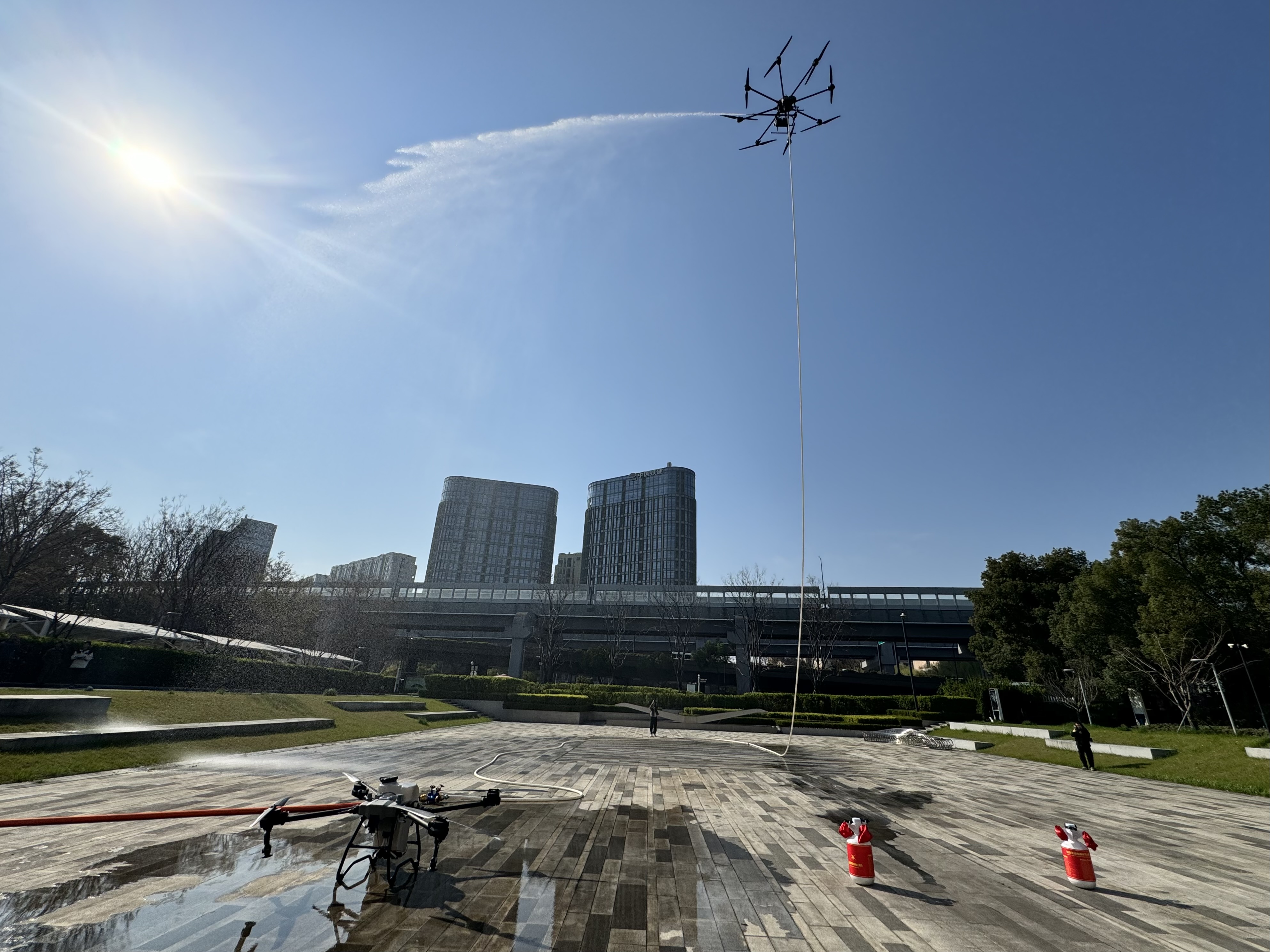 作無人機演示的企業叫做酷飛(浙江)飛行器技術有限公司,其無人機廣泛應用於巡檢、搜救、運輸、消防、農業、林業、應急和環保多個應用領域,同時擁有國際領先水平的長航時、大載重、電動多旋翼領域最全的無人機類型。公司研發生產的H300消防無人機,具備高空滅火、破窗救援、地面覆蓋滅火等三大核心功能,通過連接消防車增壓系統,無人機可在300米(約75層樓)高度直接獲取消防泡沫或水源,精準噴射火點,解決高層建築供水難題。