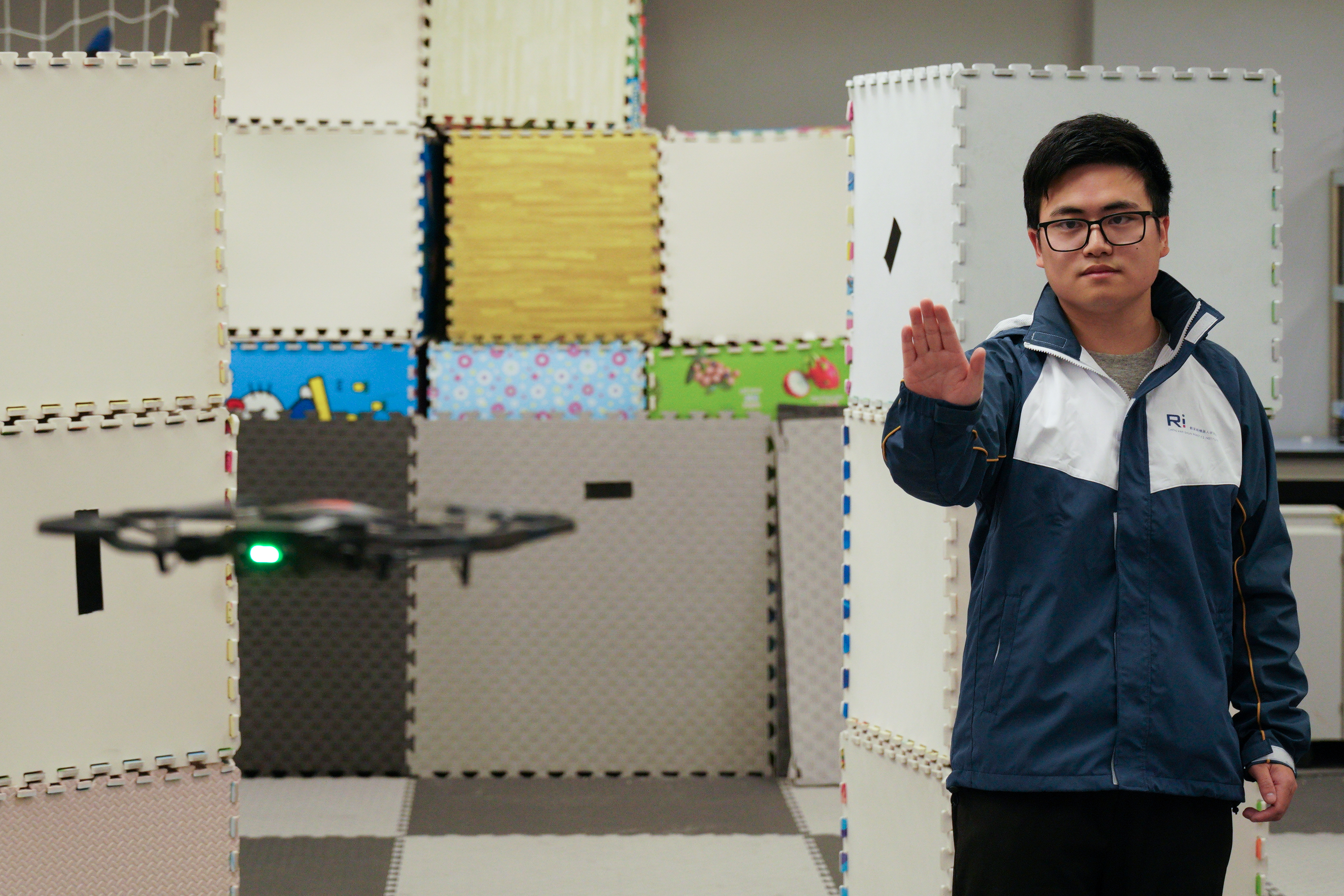 科大鄭家純機器人研究院展示了其微型自主飛艇、自主無人機導航,以及手勢控制無人機的研究成果,其中後兩者的研發團隊屬於大疆聯合實驗室,這兩項技術成果已經投入商用。科大在讀博士徐同學演示了如何只用手勢控制無人機的啟動及運行,他介紹說這主要應用於攝影拍照的任務,其安全距離為一米五至兩米。