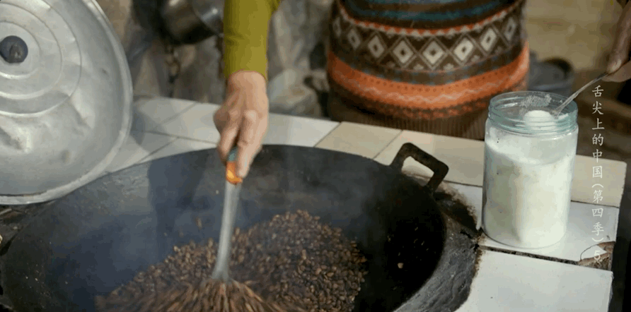 曬乾的咖啡果放入石臼中「chuǎ」一下,竹編簸箕分離外殼,再將咖啡豆倒入土竈大鍋,加入幾勺鹹鹽,炒熟後倒入石磨碾碎,便成了咖啡粉。