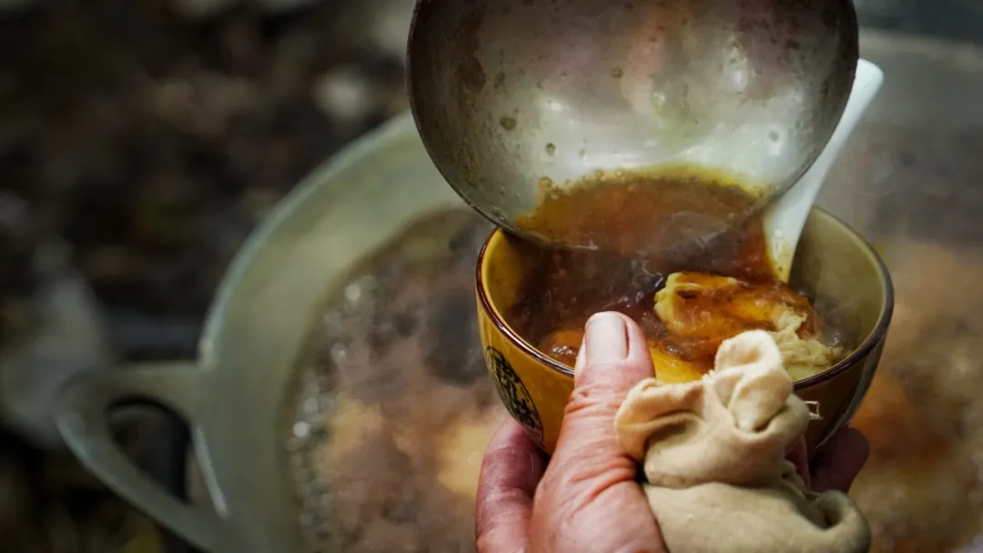 喝完一杯正宗的古法咖啡,還能吃到特別的咖啡煮雞蛋。鐵鍋燒熱咖啡,加入新鮮雞蛋煮至溏心,舀進碗裏加入紅糖、核桃碎。咖啡煮雞蛋不僅有着紅糖雞蛋的甜蜜鮮嫩,還多了咖啡的苦澀和獨特的香氣。