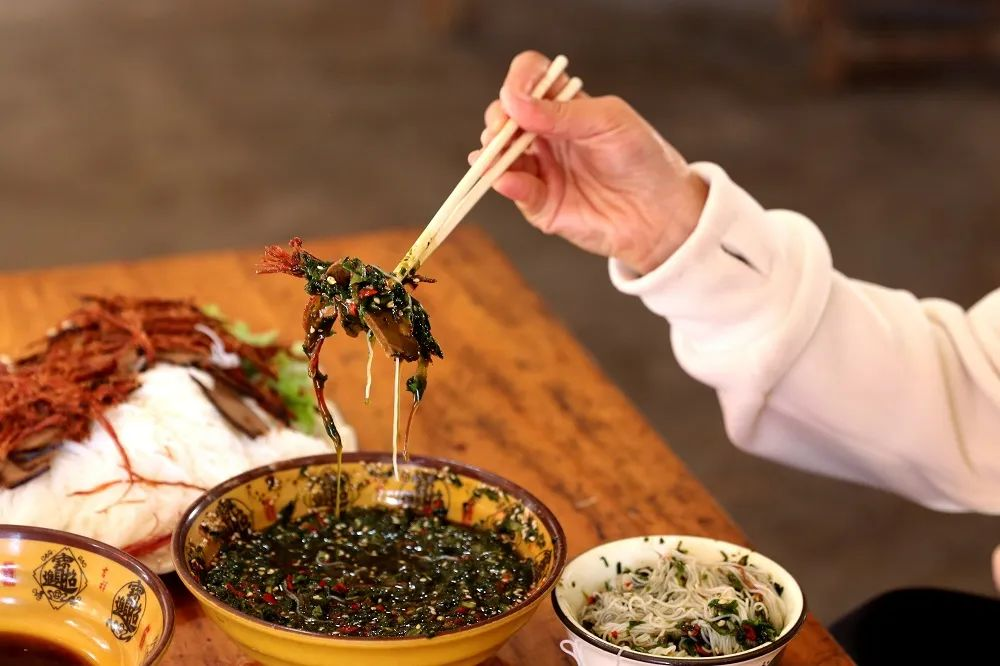 米線、油淋乾巴絲,烤牛肝、生白菜裹着蘸水入口,舌尖酸甜苦辣,頗有層次。