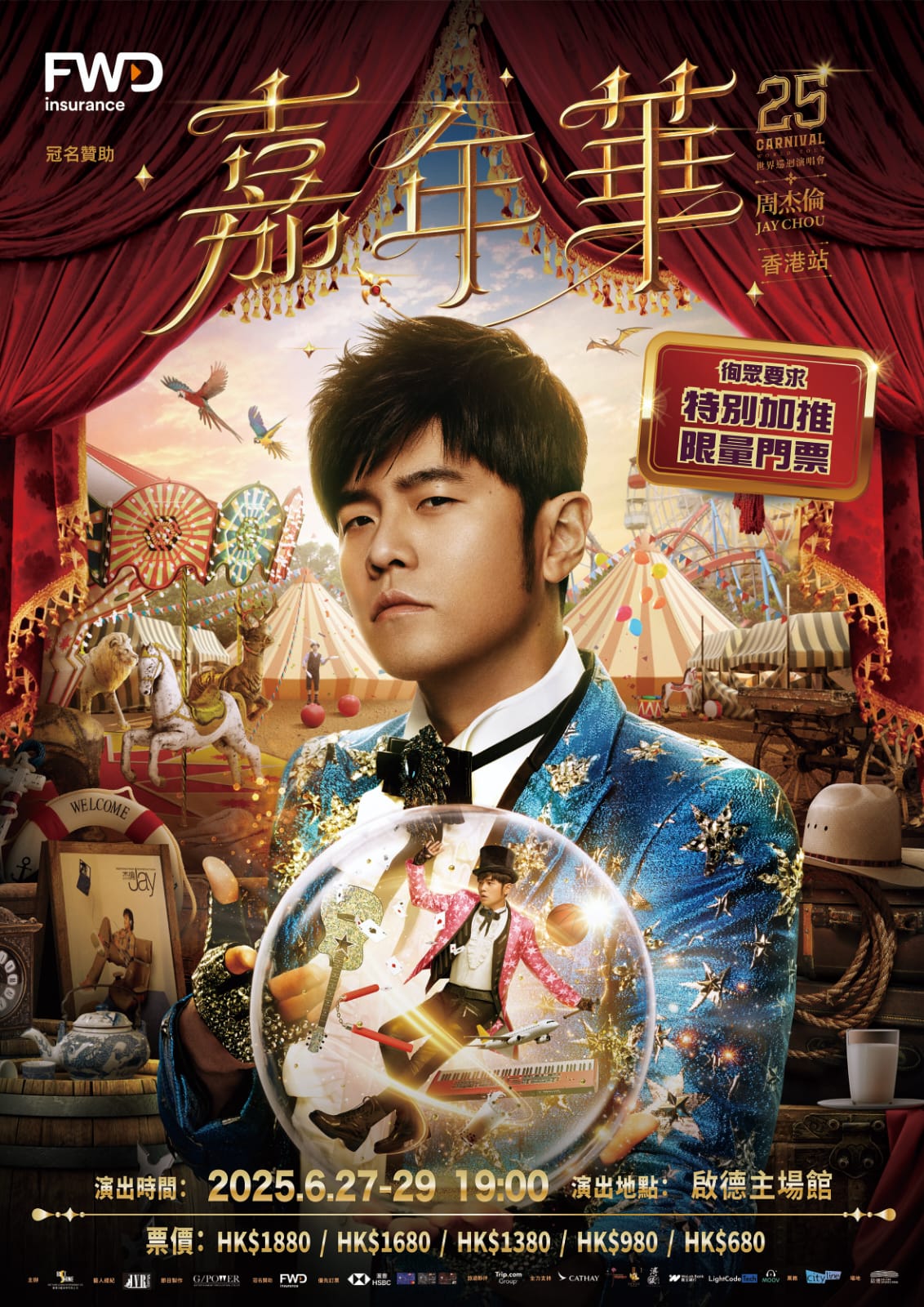 (大公文匯全媒體 特約記者 陳惠芳)周杰倫《嘉年華世界巡迴演唱會2025–香港站》」將於6月27日至29日,連續三晚,每晚7點整在啟德主場館舉行。門票從優先預購至公開發售,一經上架便被歌迷搶購一空。因此,許多未能購票的歌迷紛紛在主辦方「寶輝娛樂」官方社交媒體平台留言求票。經過主辦方與多方面的溝通及努力爭取,今天(21日)終於有好消息帶給歌迷。