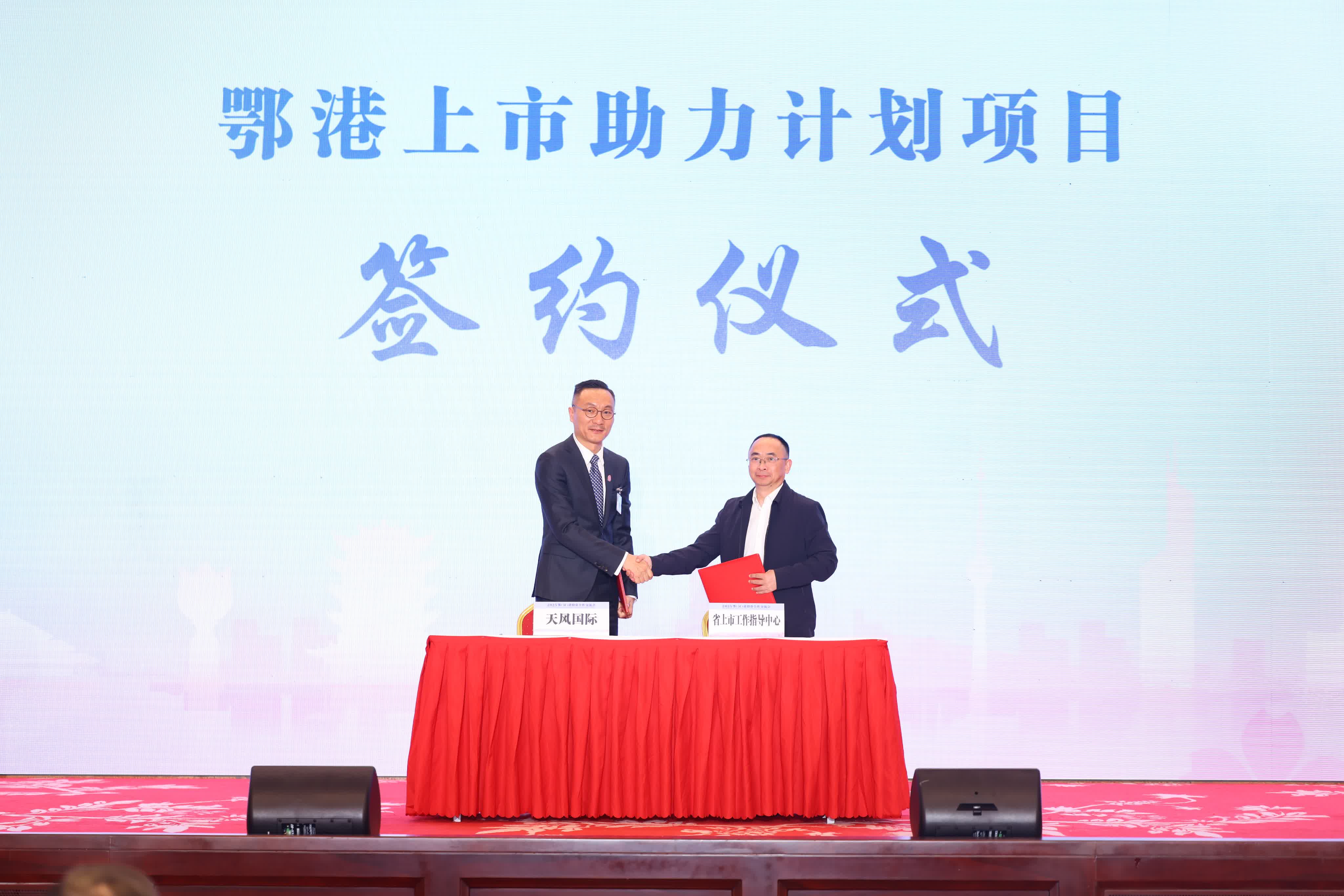 在現場嘉賓見證下,湖北省上市工作指導中心與天風國際證券簽署了「鄂企港股上市助力計劃」,同時舉行了「武漢市投資促進局經貿合作處(香港)」揭牌儀式。