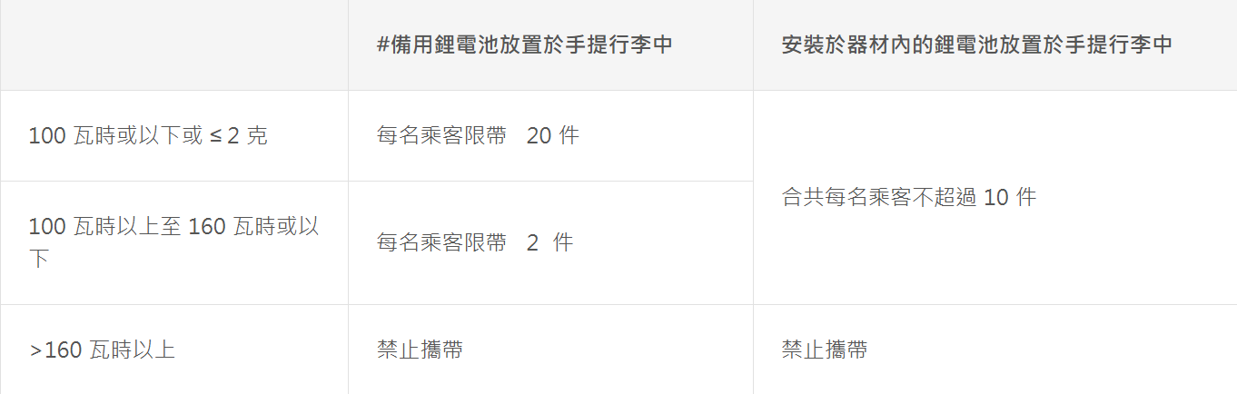 香港航空規定,任何備用鋰電池及移動鋰電池充電器均不可託運於寄艙行李內,只可存放在手提行李中,且不得在飛行過程中使用充電寶給電子設備充電。配有鋰電池的設備其電池必須拆除,獨立包裹並放置於隨身攜帶的手提行李中,鋰電池滑板及組件航司將拒載。