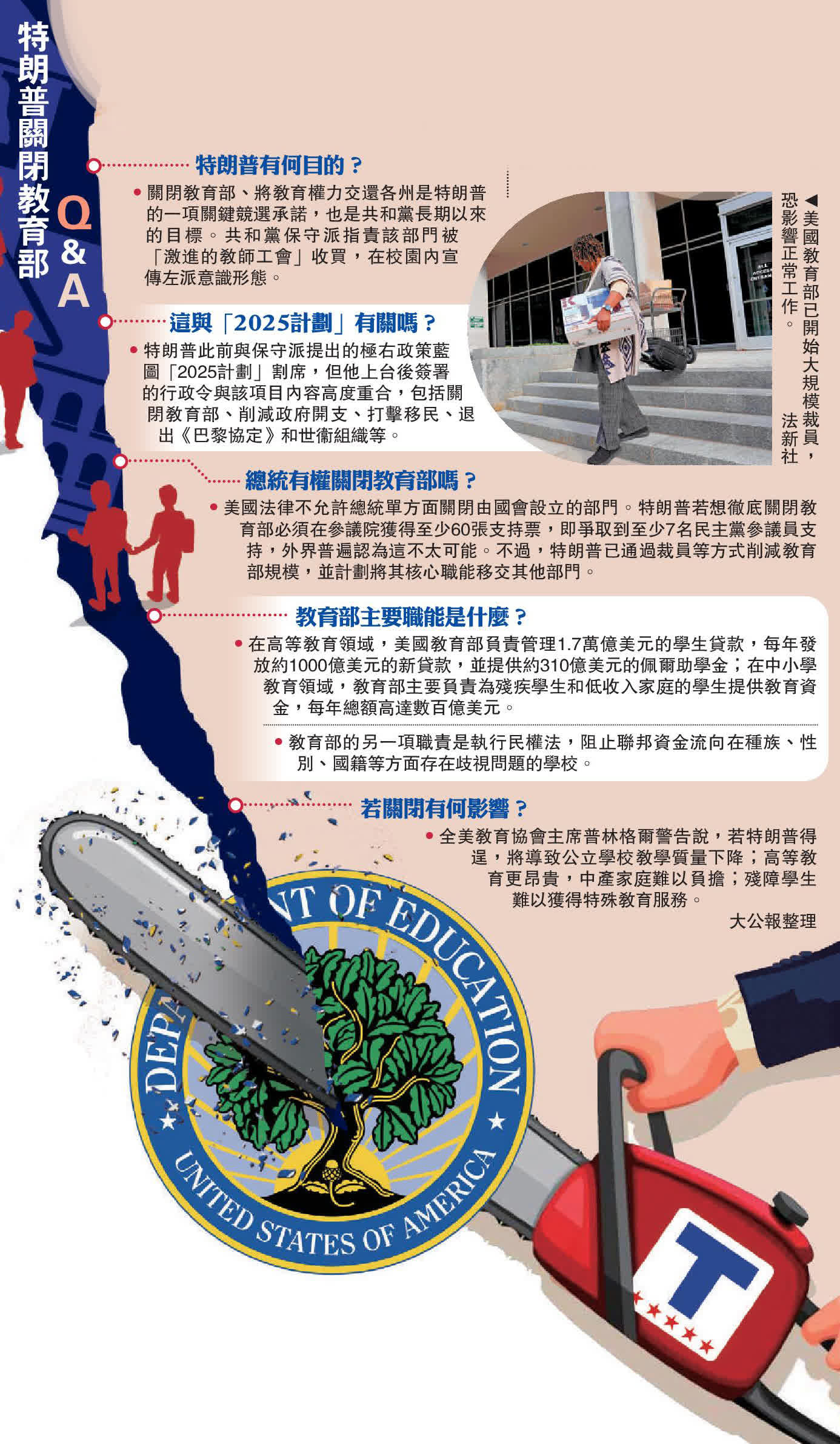 大公報綜合報道,當地時間20日,白宮舉辦了一場教育活動,特朗普在一群學生中間簽署推動關閉教育部的行政令。特朗普發表講話說,美國在教育上的支出遠遠超過其他國家,但學生成績排名卻接近墊底。他表示,政府將「採取一切合法手段關閉教育部」,針對低收入、殘疾和特殊需求學生的項目則將被保留並重新分配到其他機構和部門。他還對麥克馬洪近日的裁員行動表示讚賞,並表示教育部已成功削減約50%的員工。