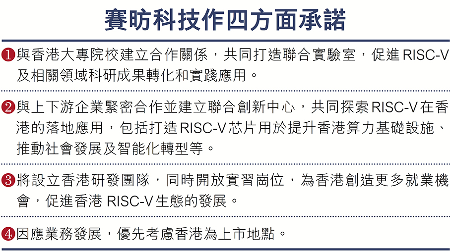 (香港文匯報 記者 殷考玲)為響應國家發展新質生產力,以及推動香港產業轉型,香港投資管理有限公司(下稱「港投公司」)與賽昉科技昨日舉行戰略合作啟動儀式,共同推動香港RISC-V(精簡指令集第五代)生態圈建設及產業集群匯聚,讓這個開源式的下代主流芯片底層技術,得以加速應用端開拓並在香港深化發展。港投公司行政總裁陳家齊昨表示,透過對賽昉科技的投資與合作,雙方將合力推進香港RISC-V產業的發展,包括攜手整合芯片設計、系統開發與應用場景資源,推動構建從「指令集架構」到終端應用的垂直創新鏈。