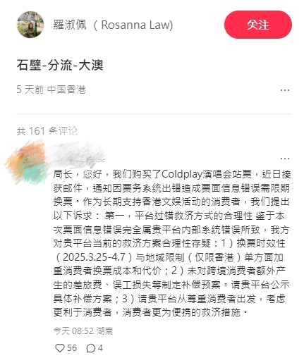 許多內地網民在羅淑佩的小紅書主頁留言,質疑Cityline的處理方式不合理,並要求平台公開道歉及改進票務管理流程。有網民建議Cityline免費將新門票郵寄至消費者指定地址,或更新系統識別錯誤門票,避免換票麻煩。若上述方案無法執行,網民認為應向受影響消費者提供賠償。
