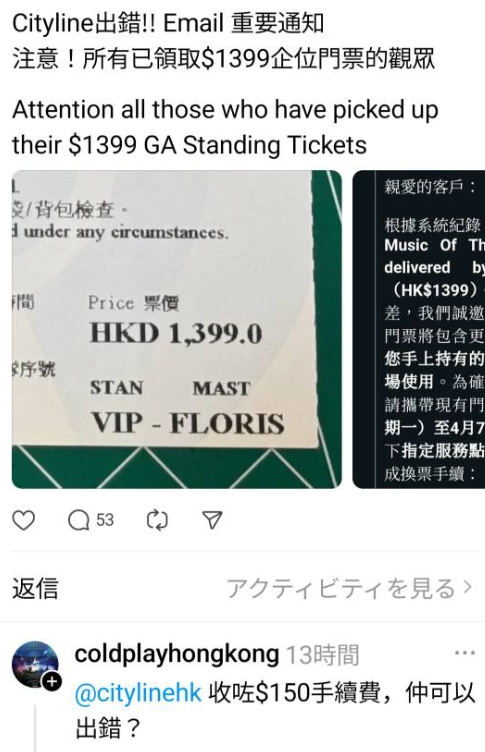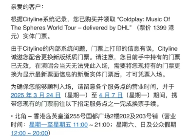 大公文匯全媒體報道,英國樂隊Coldplay將於4月8日至12日在香港啟德主場館舉行巡迴演唱會,實體票已於上周起開放領取。然而,近日有內地網民在社交平台「小紅書」反映,收到票務平台Cityline的通知,指「門票上打印的信息有誤」,需於3月24日至4月7日期間,親身到香港7個指定地點更換新門票,否則無法入場。