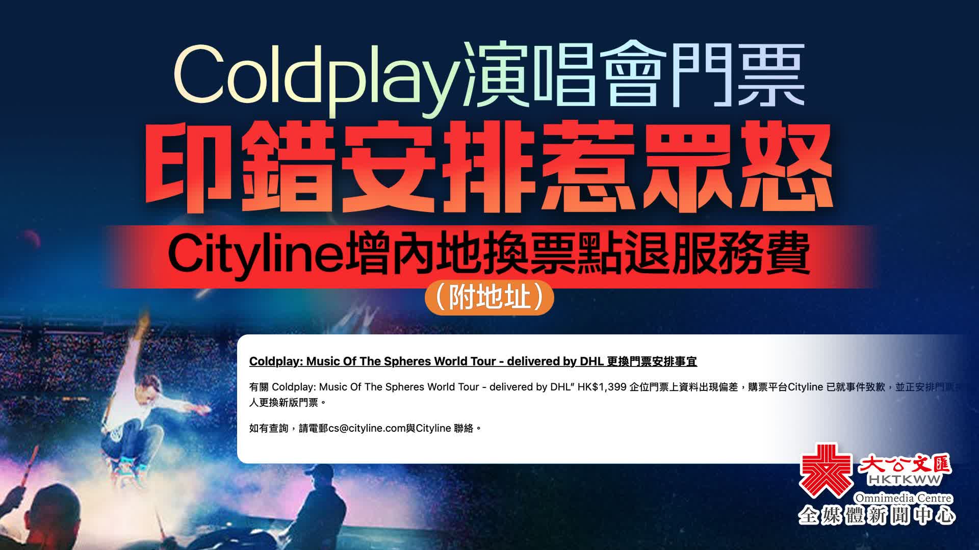 大公文匯全媒體報道,英國樂隊Coldplay將於4月在啟德體育園主場館舉行巡迴演唱會《Coldplay: Music Of The Spheres World Tour》,但有已取得門票樂迷接獲售票網Cityline通知,指「門票上的資料出現偏差」,須於演唱會舉行前兩周,到本港7個指定地點換領新門票,引發大量粉絲不滿。