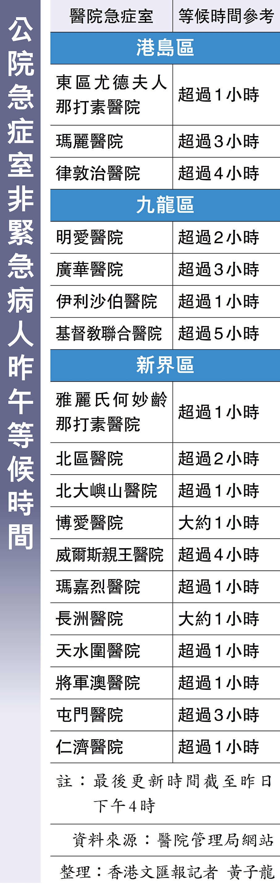 記者昨日下午在聯合醫院急症室所見,不少求診人士要長時間等候。69歲的溫先生由於前列腺疼痛到急症室求診,表示已等候近4個小時。