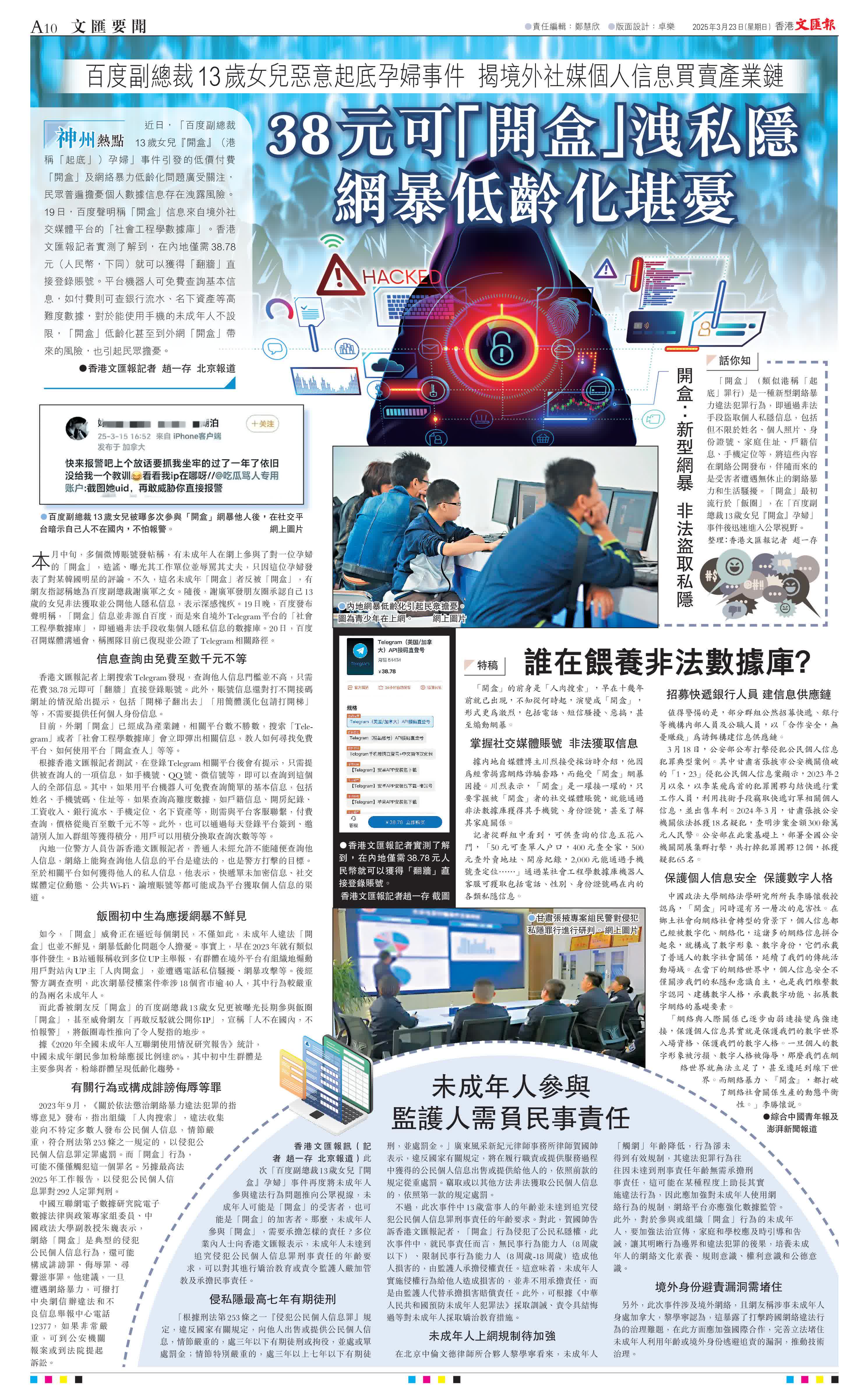 (香港文匯報記者 趙一存 北京報道)近日,「百度副總裁13歲女兒『開盒』(港稱「起底」)孕婦」事件引發的低價付費「開盒」及網絡暴力低齡化問題廣受關注,民眾普遍擔憂個人數據信息存在洩露風險。19日,百度聲明稱「開盒」信息來自境外社交媒體平台的「社會工程學數據庫」。香港文匯報記者實測了解到,在內地僅需38.78元(人民幣,下同)就可以獲得「翻牆」直接登錄賬號。平台機器人可免費查詢基本信息,如付費則可查銀行流水、名下資產等高難度數據,對於能使用手機的未成年人不設限,「開盒」低齡化甚至到外網「開盒」帶來的風險,也引起民眾擔憂。