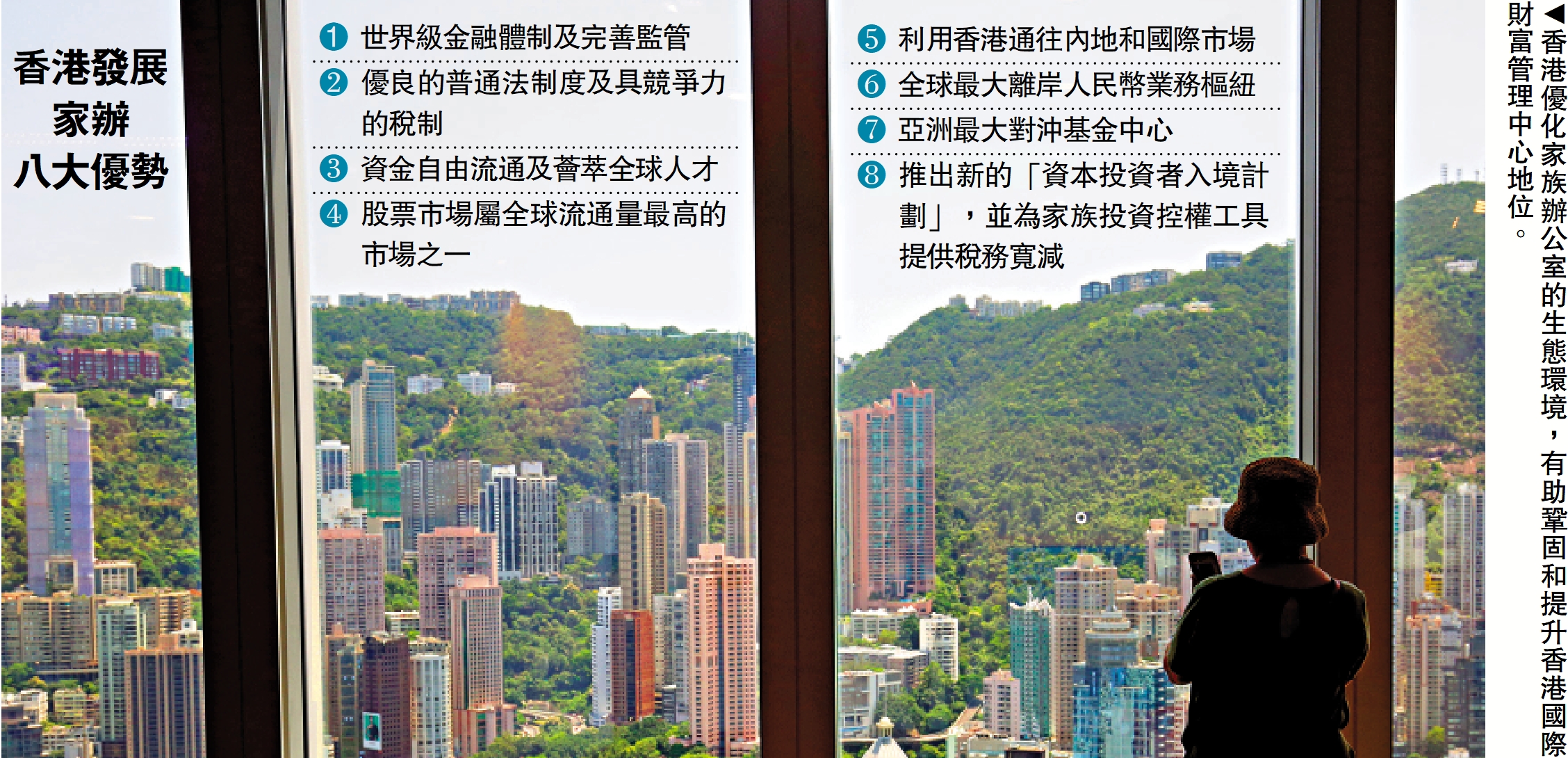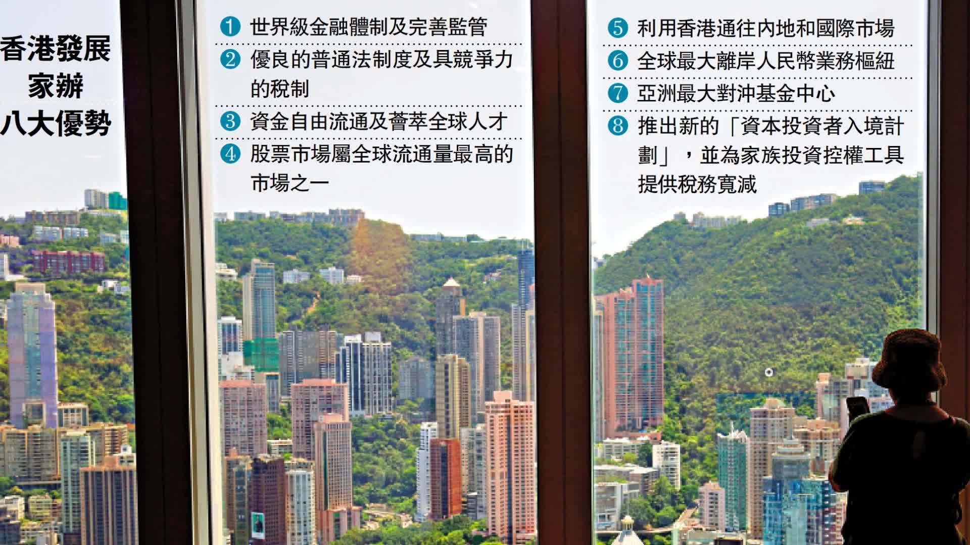 香港憑藉稅務優惠政策、靈活的監管環境及不斷優化的移民政策,吸引大量高淨值家族進駐。截至2023年底,香港的資產和財富管理業務規模達31.2萬億元,成為全球第二大跨境財富管理中心,擁有超過2700家單一家族辦公室。此外,投資推廣署已協助超過160間家族辦公室在港設立或擴展業務。