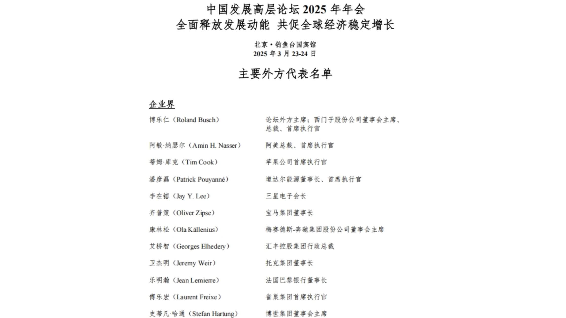 年會主要外方代表名單包括,西門子股份公司董事會主席、總裁、首席執行官博樂仁(Roland Busch)、蘋果公司首席執行官蒂姆·庫克(Tim Cook)、三星電子會長李在鎔(Jay Y. Lee)、寶馬集團董事長齊普策(Oliver Zipse)、梅賽德斯-奔馳集團股份公司董事會主席康林松(Ola Källenius)、高通公司總裁、首席執行官安蒙(Cristiano Amon)等將參加。