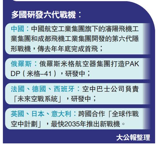 中國:中國航空工業集團旗下的瀋陽飛機工業集團和成都飛機工業集團開發的第六代隱形戰機,傳去年年底完成首飛;