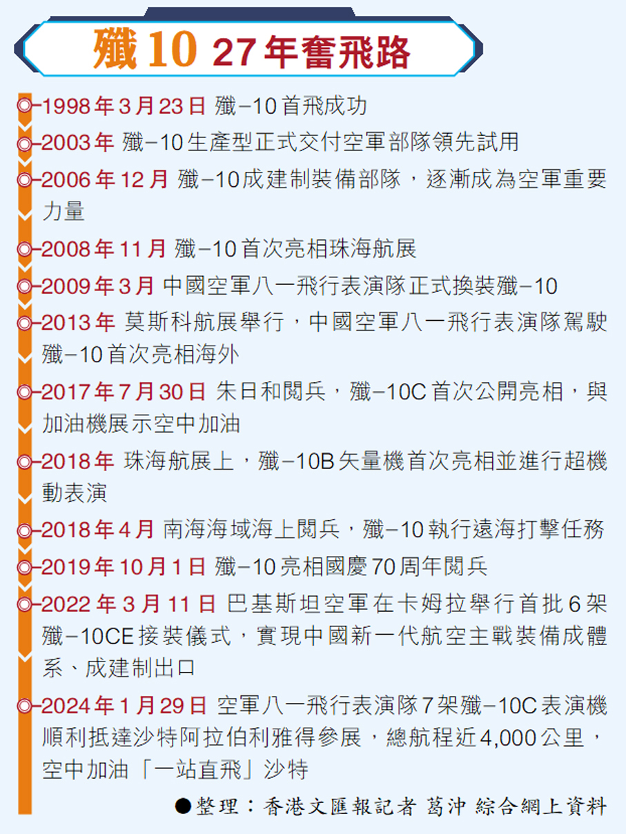 (香港文匯報 記者 葛沖 北京報道)27年前,一架「絕密戰機」在某試飛場一飛沖天,讓中國戰鬥機實現從引進、仿製到自主研製的跨越式發展。這就是中國第一款自主研製的第三代戰鬥機殲-10。有國產「爭氣機」之稱的殲-10的誕生,極大縮小了中國與航空強國在戰鬥機領域的差距,標誌着中國成為世界上少數能夠研發第三代戰鬥機的國家。昨日正是殲-10首飛27周年紀念日。如今,這架國產「爭氣機」已進化為「空中多面手」,專家指出,殲-10成系列化發展,在中國空軍建設的洪流中發揮中堅力量,捍衛國家主權和領土完整。中國戰機27年間不斷迭代升級,顯示中國航空工業跨越式發展成就,背後是中國科技、國防、經濟實力的躍升。