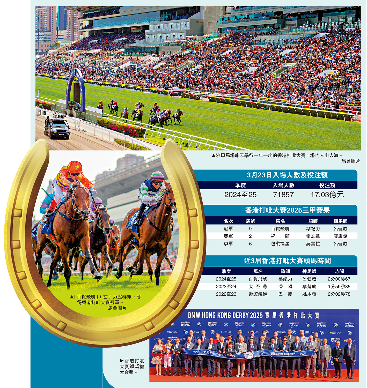 (大公報 記者 張銳、朱家立)寶馬香港打吡大賽2025昨天在沙田馬場舉行。作為4歲馬匹開展競賽生涯的實力里程碑,以及「香港盛匯超級三月」的焦點世界級盛事,本屆打吡大賽吸引近7.2萬人入場,當中沙田馬場的入場人數超過6.1萬人,內地及海外旅客的入場人數逾9000人,兩者皆創下歷來香港打吡賽馬日新高。投注額方面,昨10場賽事共錄得逾17億港元,也是打吡大賽的新紀錄,較去年升3.2%。