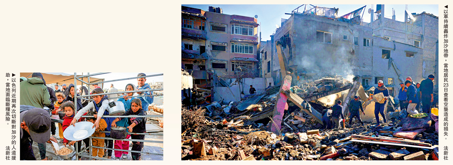 加沙今年1月一度實現停火,但以色列於本月18日以哈馬斯拒絕美國提出的延長停火協議為由,恢復對加沙的大規模空襲,並於19日恢復地面行動。過去20多天,以色列禁止食物、水和藥品等援助物資進入加沙,加劇當地人道主義危機。另外,以軍23日再次突襲約旦河西岸,逮捕13人。