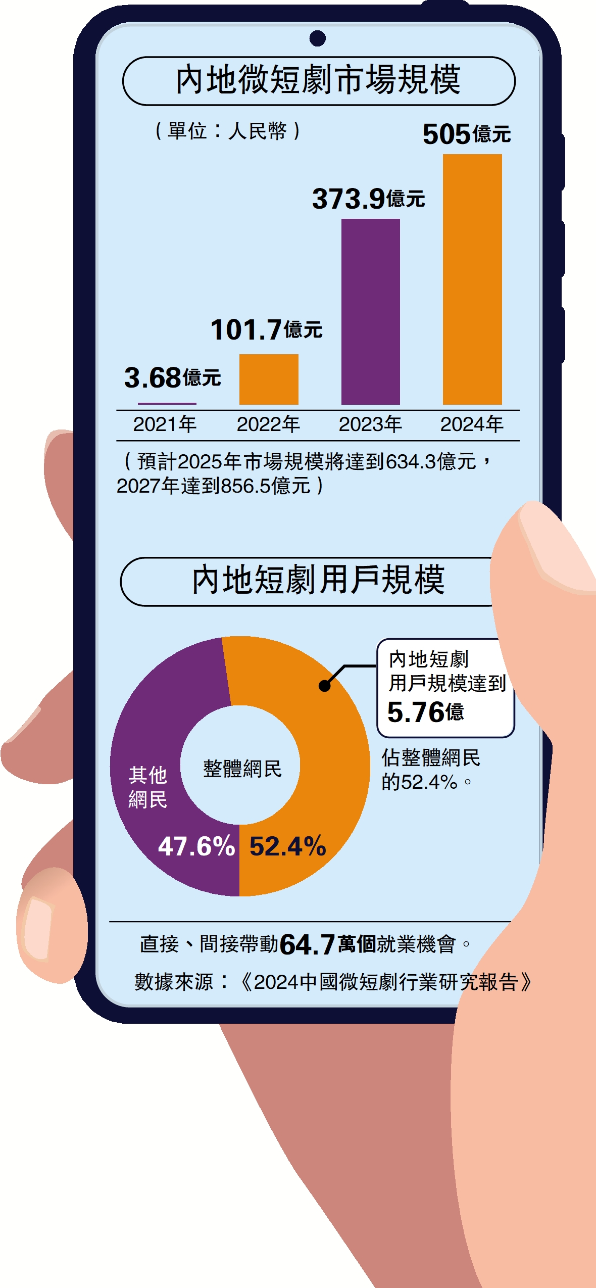中國網絡視聽協會日前發布《2024微短劇行業洞察報告》,公布2024年國內微短劇市場規模已達到505億元(人民幣,下同),首次超過電影票房規模。「目前豎屏微短劇的成本多數還是在四五十萬,一百多萬在豎屏就算很高的成本。它們實際上的拍攝周期通常只要一周左右,內容完成後只需經過平台自審就能上架。」騰訊視頻懸疑短劇《反詐風暴》製片人陳秋雨在接受大公報記者採訪時提到,這樣成本低、周期短、變現快的新興影視領域一時間彷彿成為搖錢樹的代名詞,吸引無數投資人、製作者爭相入局。