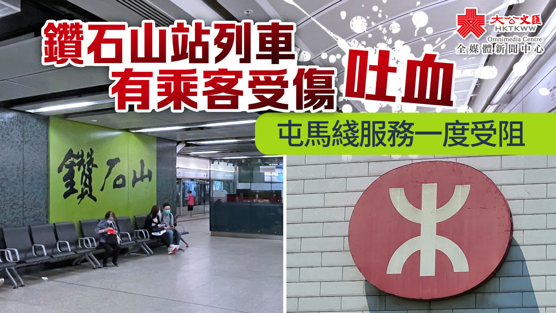 大公文匯全媒體報道,警方今日(24日)早上9時40分左右接獲報案稱,港鐵鑽石山站往屯門方向的一列列車上,有乘客受傷吐血,救援人員接報到場,受傷男子清醒有反應。由於發生事故,屯馬綫服務一度受阻,其後服務回復正常。