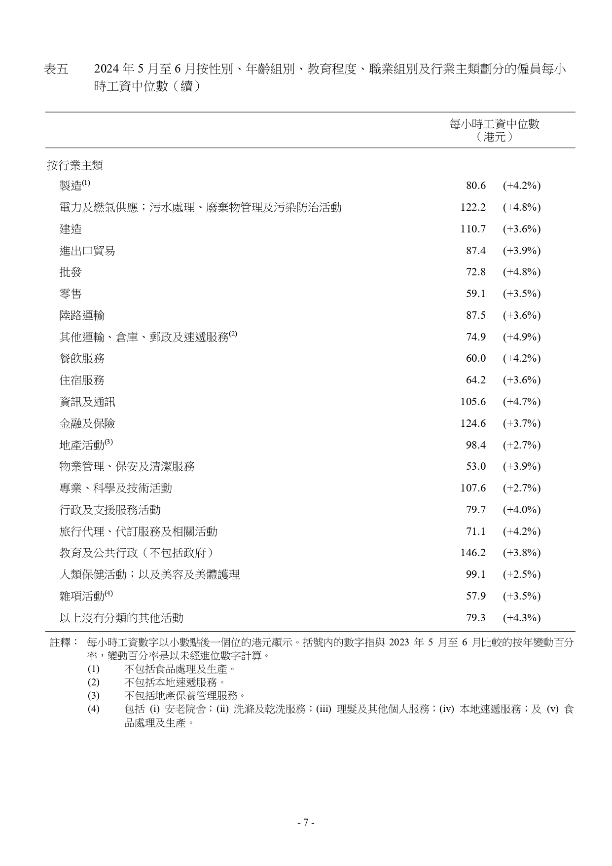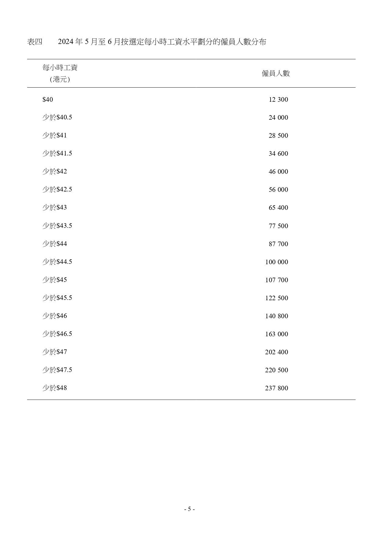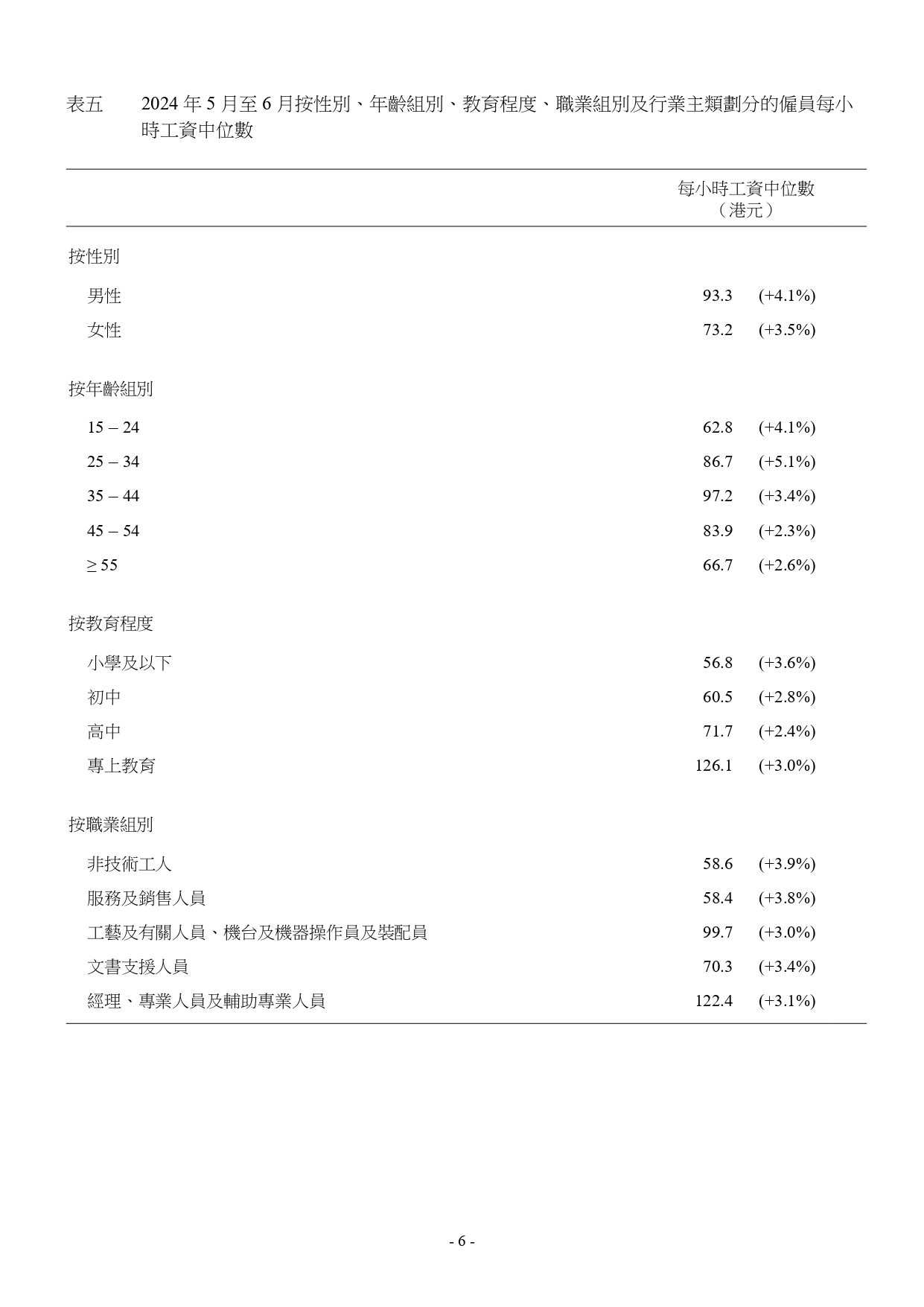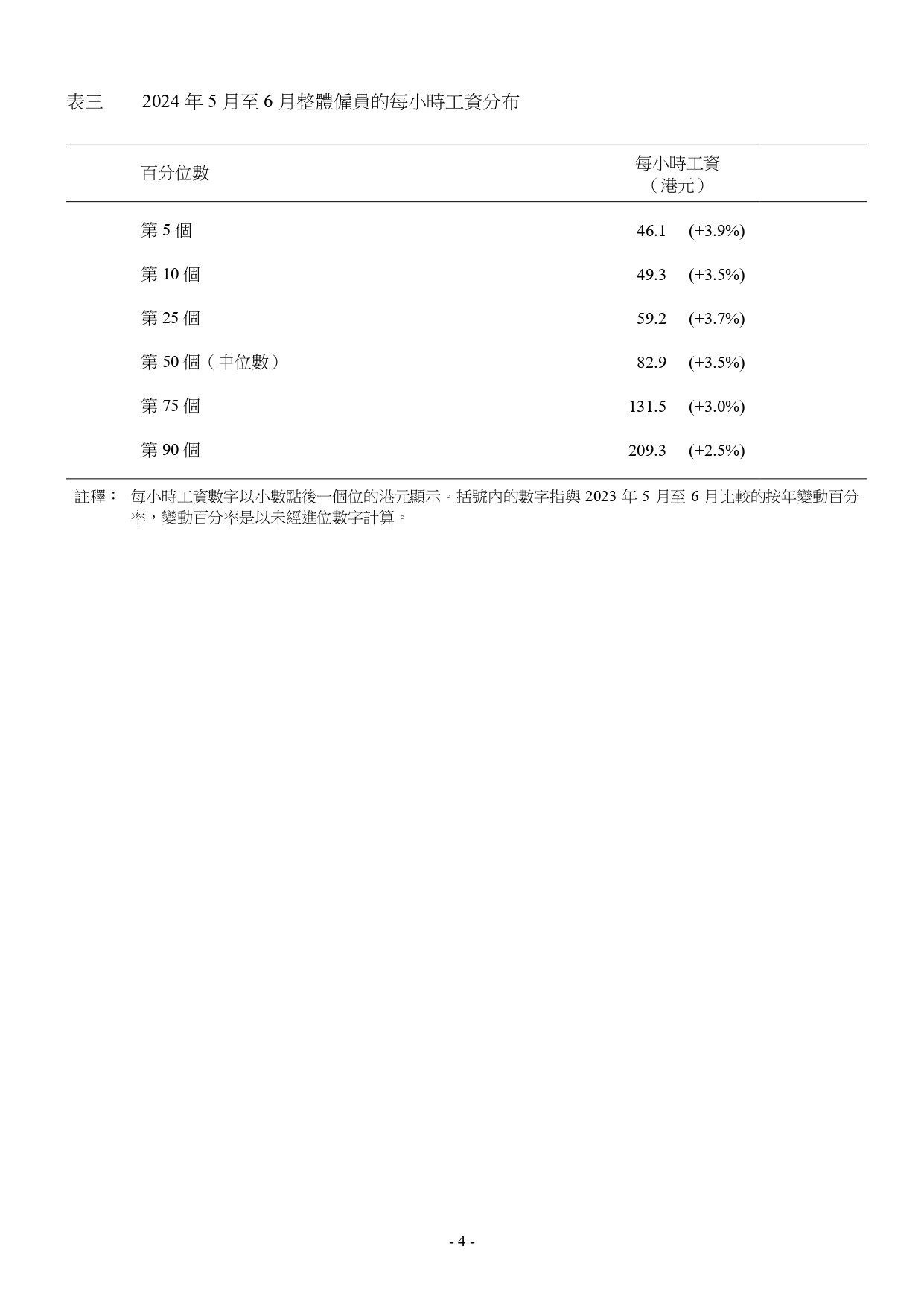 2024年5月至6月本港僱員的每小時工資中位數為$82.9,較2023年5月至6月的中位數($80.1)高3.5%。每小時工資的第5個、第10個、第25個、第75個及第90個百分位數分別為$46.1、$49.3、$59.2、$131.5及$209.3。