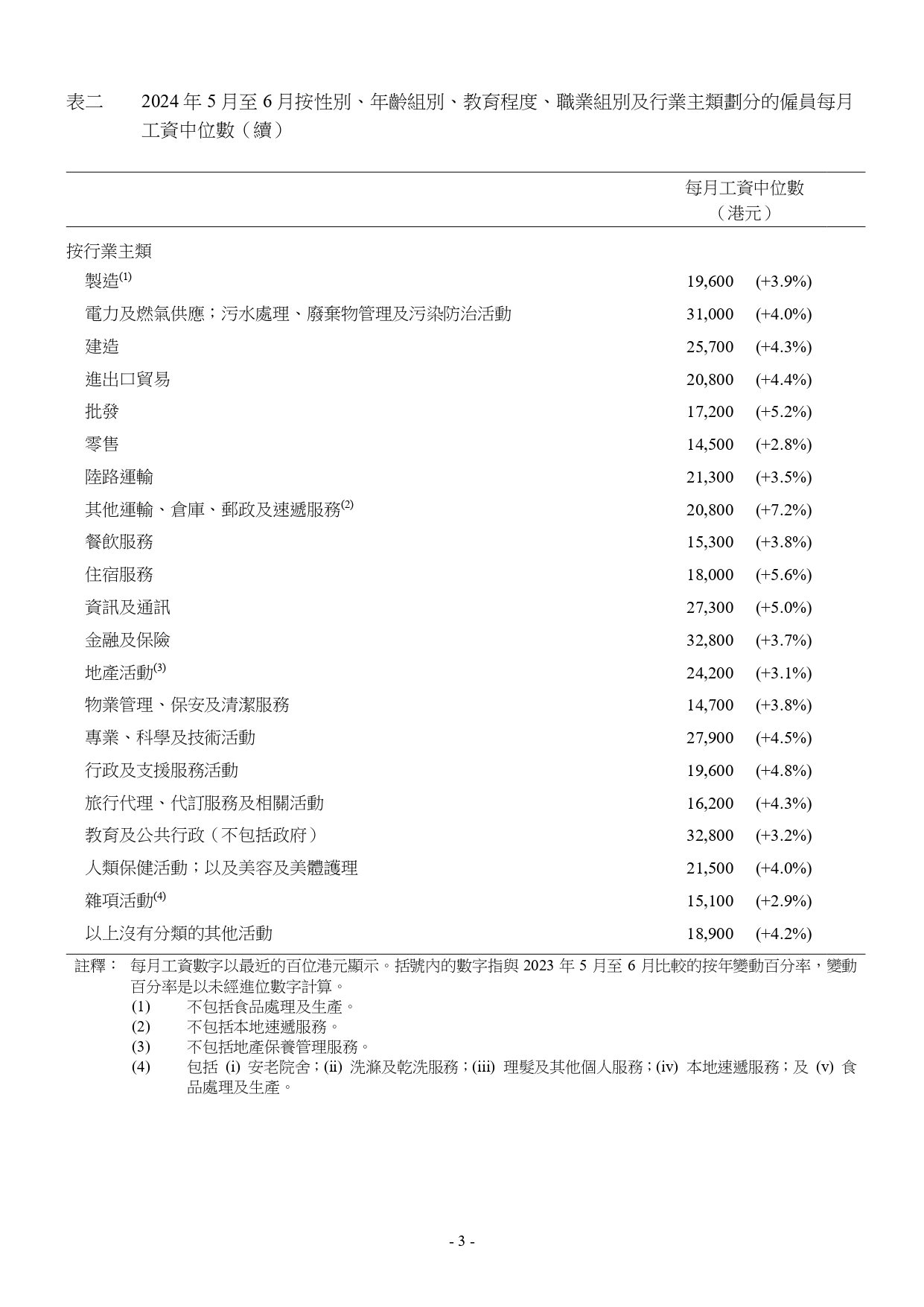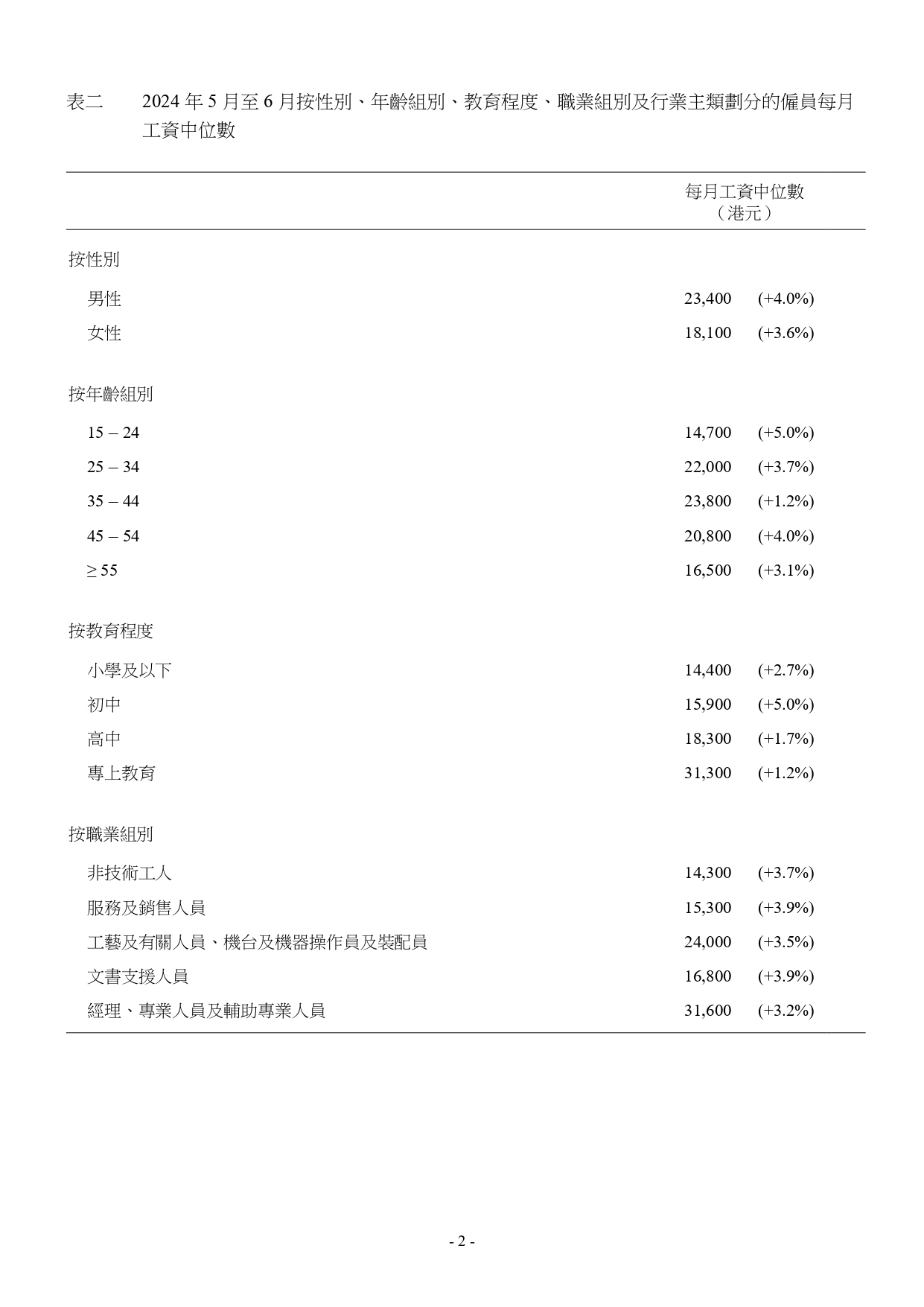 男性及女性僱員的每月工資中位數,以及不同年齡組別、教育程度、職業組別和行業主類的僱員每月工資中位數,均錄得升幅。其中從事金融及保險、教育及公共行政(不包括政府)的僱員賺得最多,月入中位數最高,為3.28萬元。