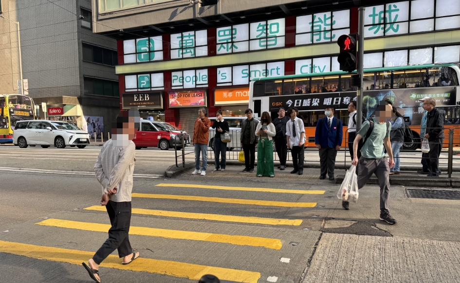 記者在莊士敦道灣仔站A3出口前的路口,僅觀察了約2分鐘,就目擊到有行人不顧紅燈亮起穿越斑馬線,雖然通過時斑馬線左右5米內都無車通行,但這仍然屬於違規行為。除了闖紅燈的現象,記者更看到有行人為節省幾步路,直接橫穿馬路,棄用一旁的斑馬線,危險系數直線上升。