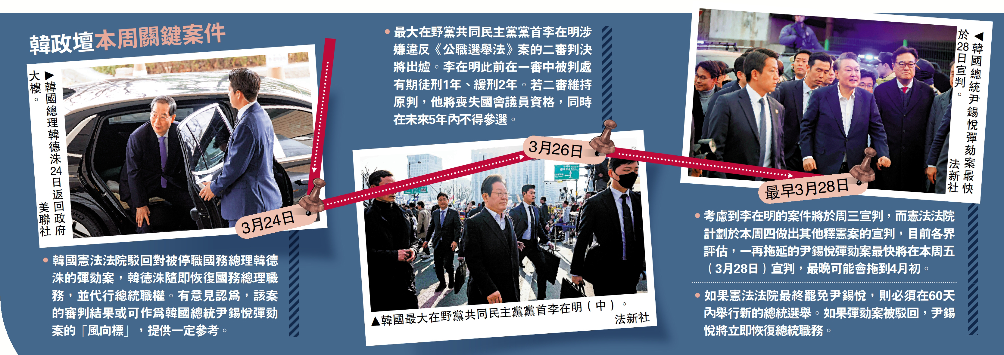 大公報綜合報道,韓國憲法法院24日對國務總理韓德洙彈劾案作出宣判,駁回對其的彈劾。韓德洙隨即恢復國務總理職務,並代行總統職權。26日,最大在野黨共同民主黨黨首李在明涉嫌違反《公職選舉法》案二審判決將出爐。而拖延已久的總統尹錫悅彈劾案最快預計於28日宣判。韓媒稱,這3宗案件接連宣判,意味着韓國政壇或將迎來「前所未有的動盪一周」。