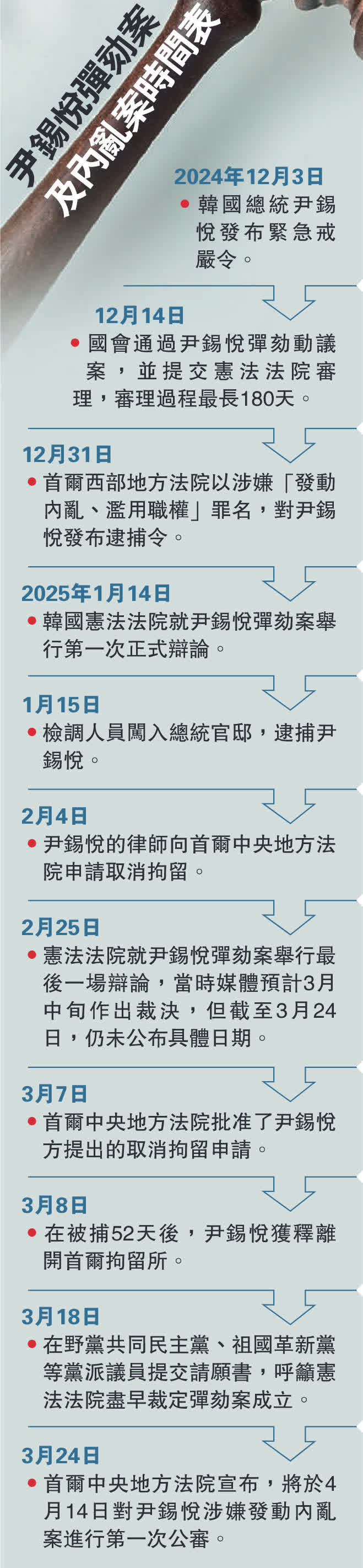 •考慮到李在明的案件將於周三宣判,而憲法法院計劃於本周四做出其他釋憲案的宣判,目前各界評估,一再拖延的尹錫悅彈劾案最快將在本周五(3月28日)宣判,最晚可能會拖到4月初。