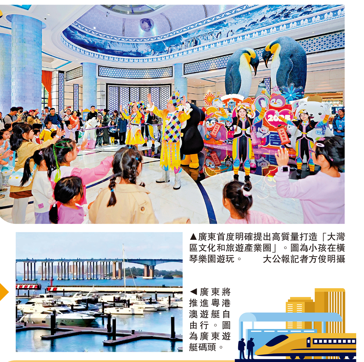 •打造灣區海上「一程多站」旅遊線路;發展水上運動、河湖郵輪遊艇等水經濟旅遊產業,推進粵港澳遊艇自由行