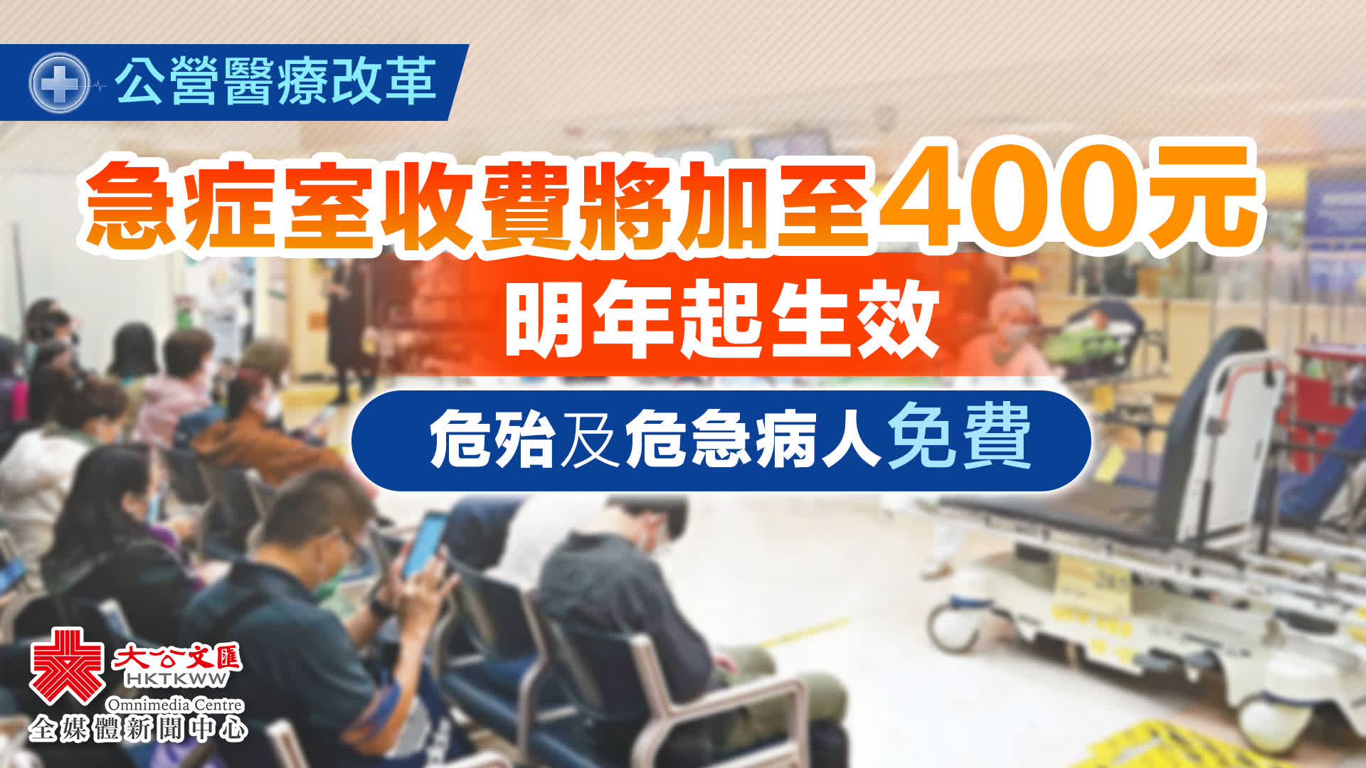 急症室現時所有本港居民劃一收費為180元。高拔陞表示,急症室收費將建議調整為400元,一類危殆及二類危急病人豁免收費,以體現急症室的功能,讓資源能更好運用在病人身上;急症醫院住院病床,收費每日300元;療養、復康及精神科病床,每日收費200元。門診服務方面,普通科門診每次收150元,並會收取每種藥5元給予最多4星期的份量;專科門診費用會調升,每次診症收費250元,藥費收每種藥20元,最多處方4星期的份量。