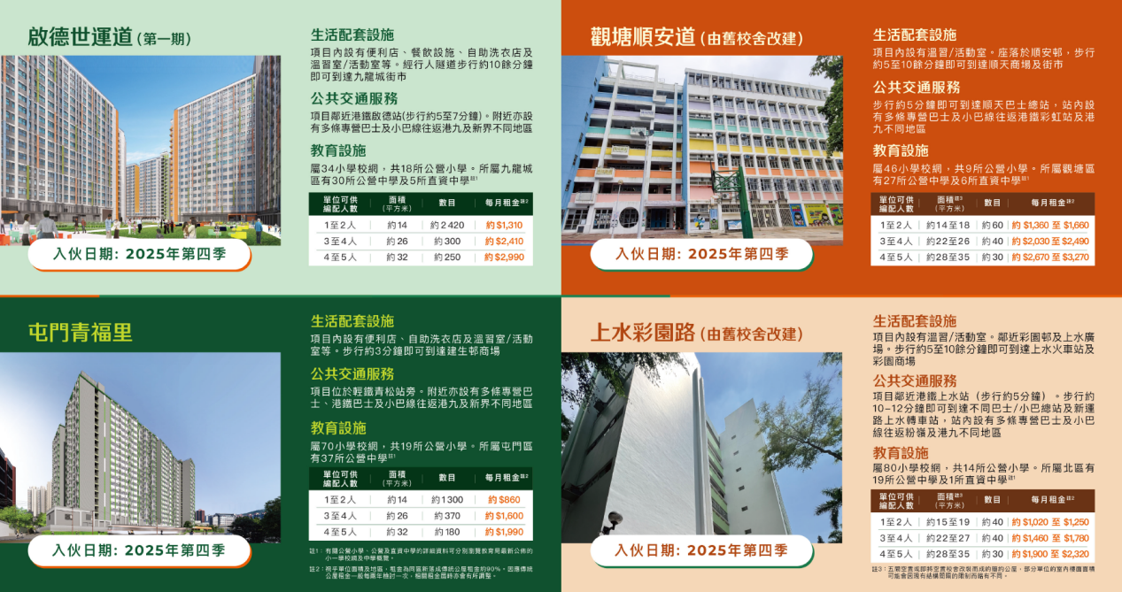 觀塘順安道(由校舍改建):提供約130個單位,步行約五分鐘即可到達順天巴士總站,站內設有多條專營巴士及小巴線往返港鐵彩虹站及港九不同地區,預計每月租金約1,360元至3,270元。