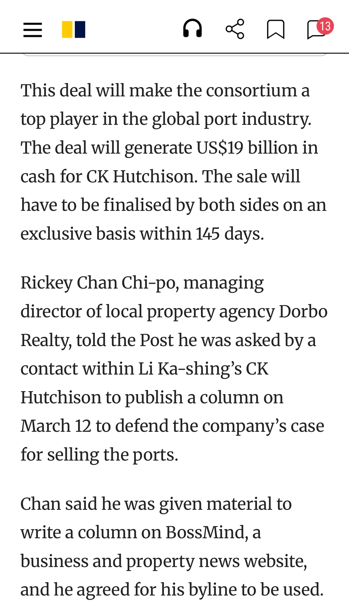 大公文匯全媒體報道,本港企業長江和記實業早前計劃出售巴拿馬運河港口等資產一事持續受到高度關注,引發了社會廣泛討論。據《南華早報》今日(25日)報道稱,本港房地產代理公司Dorbo Realty的董事總經理Rickey Chan Chi-po告訴該報,長江和記實業內部的一名聯繫人要求他於3月12日發表一篇專欄文章,為該公司出售港口的理由辯護。