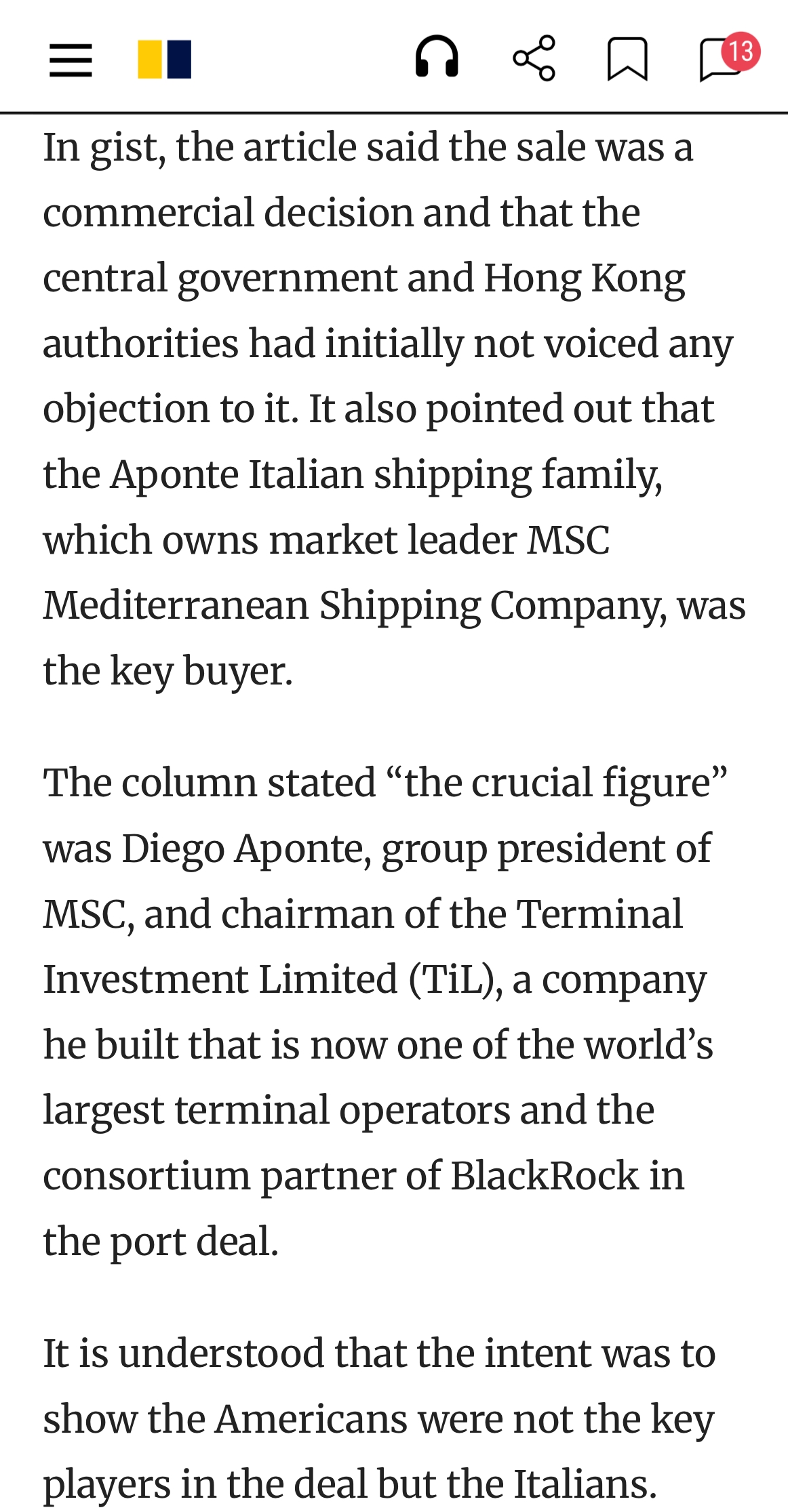 專欄指出,「關鍵人物」是地中海航運公司集團總裁兼碼頭投資有限公司(TiL)董事長迭戈·阿龐特(Diego Aponte),是全球最大的碼頭運營商之一,也是貝萊德在港口交易中的財團合作夥伴。此舉意在表明,這筆交易的關鍵人物不是美國人,而是意大利人。此外,陳先生拒絕透露是哪位長江和記的高管向他提供了該專欄的材料。